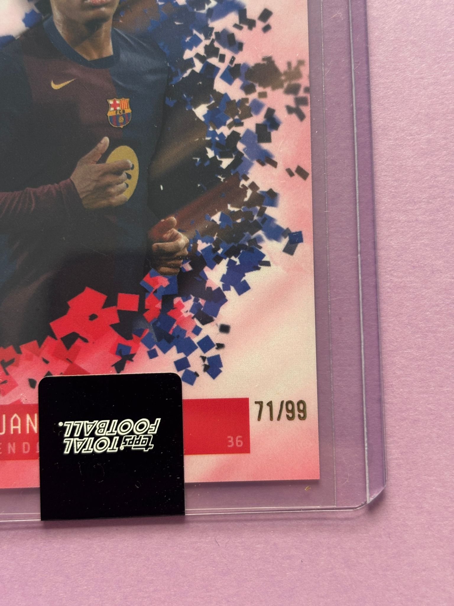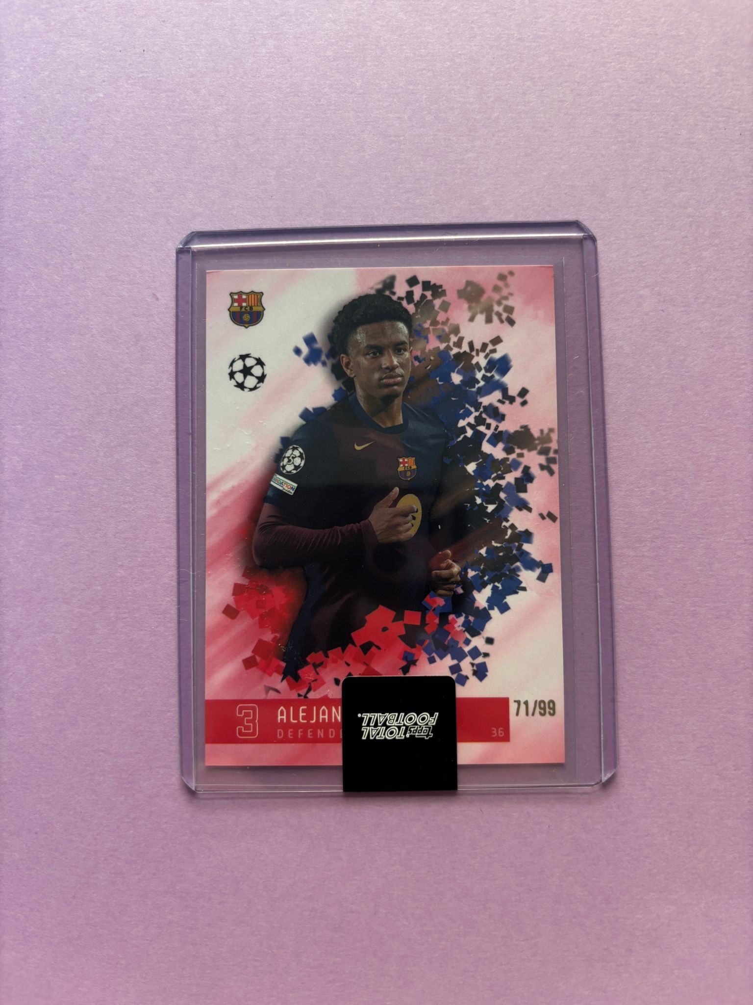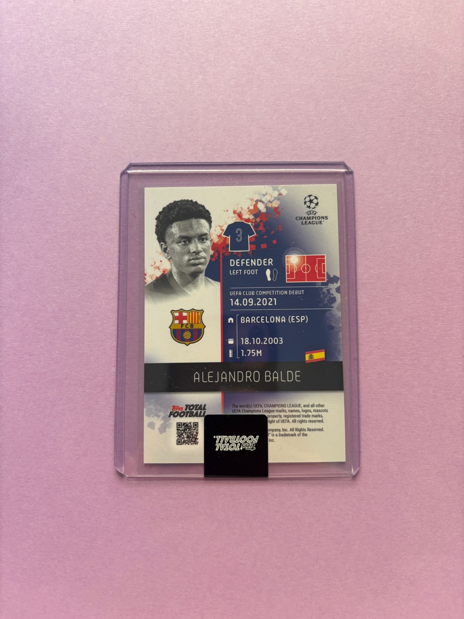 Carta de Topps Total Football en su Metacrilato en perfecto estado, del jugador Alejandro Balde en el Barcelona en la temporada 2024/2025 en su versión BASE SET con la numeración 71/99.