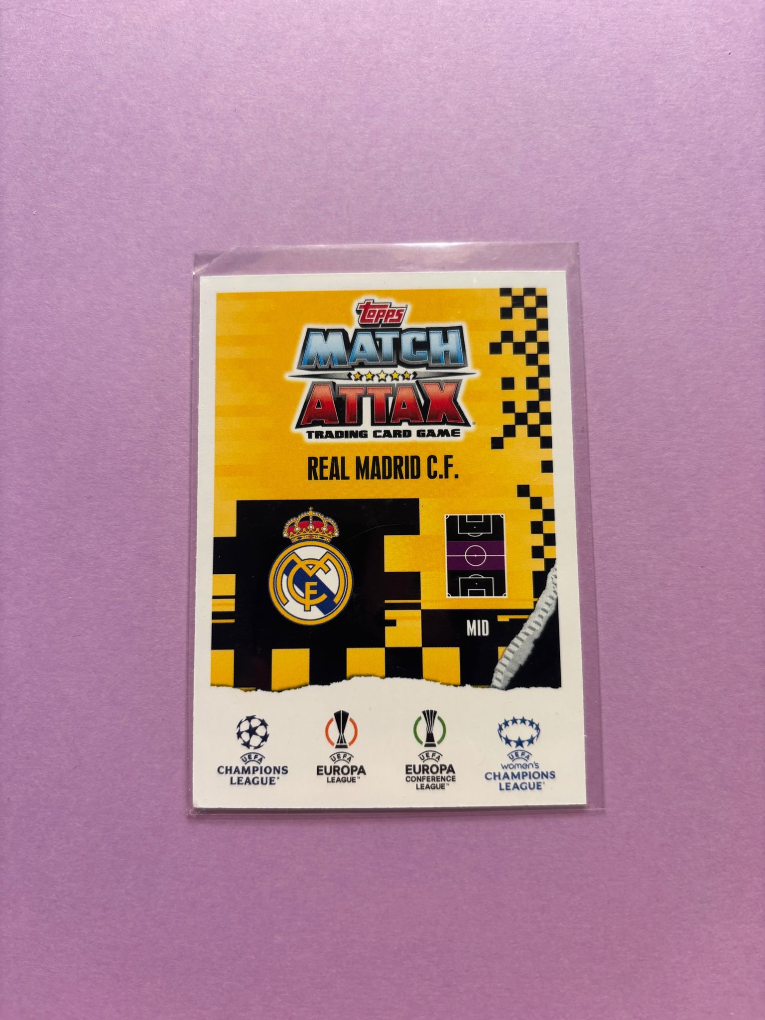 Carta de Topps Match Attax Extra en su Sleeve en perfecto estado, del jugador Arda Güler en el Real Madrid en la temporada 2023/2024 en su versión Breakthrough Ballers.