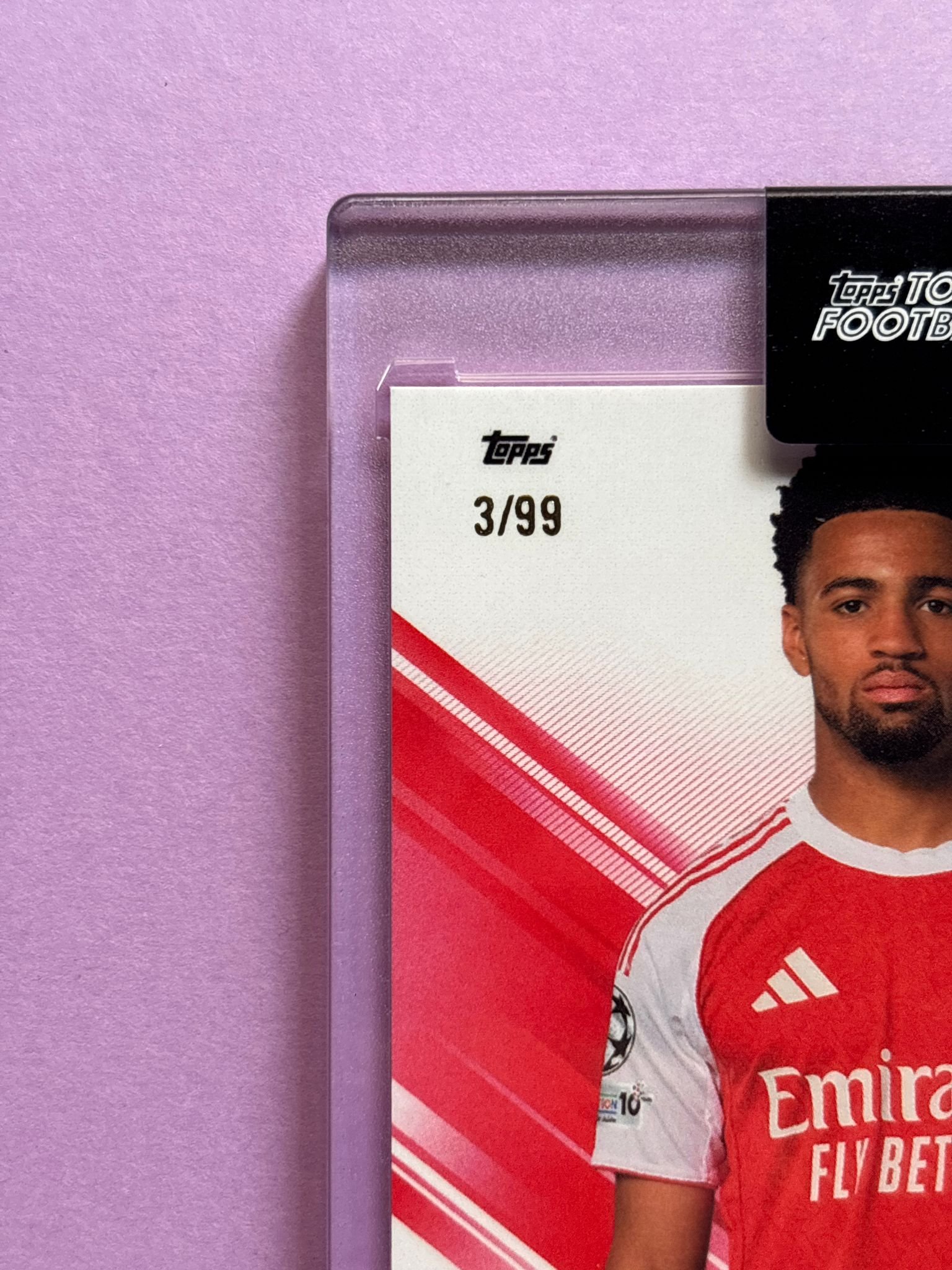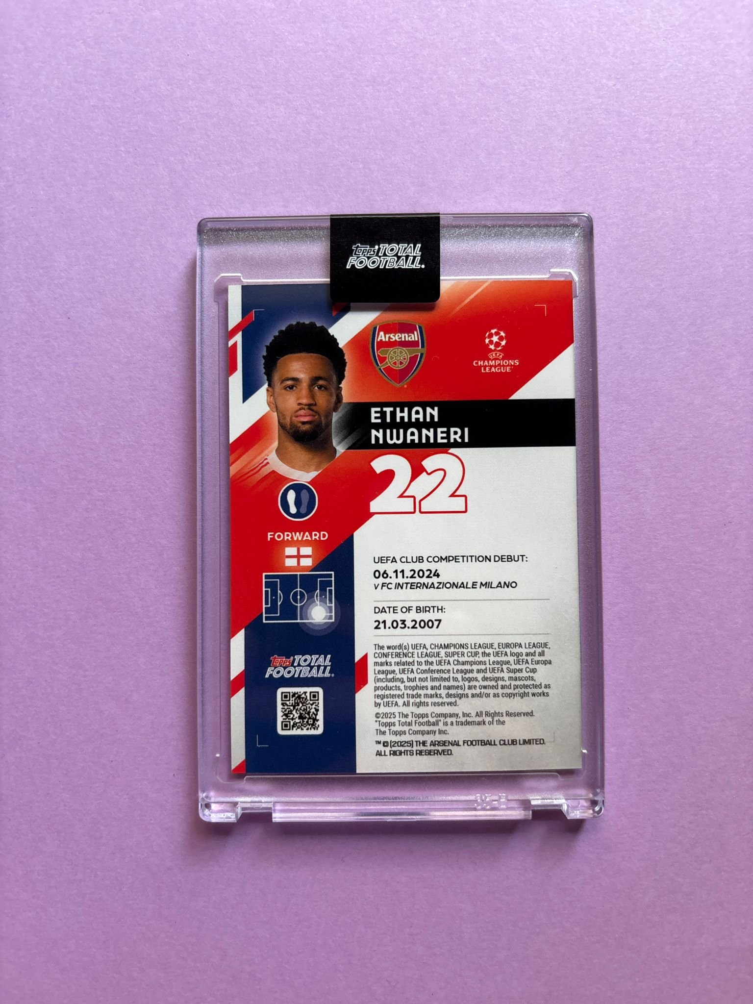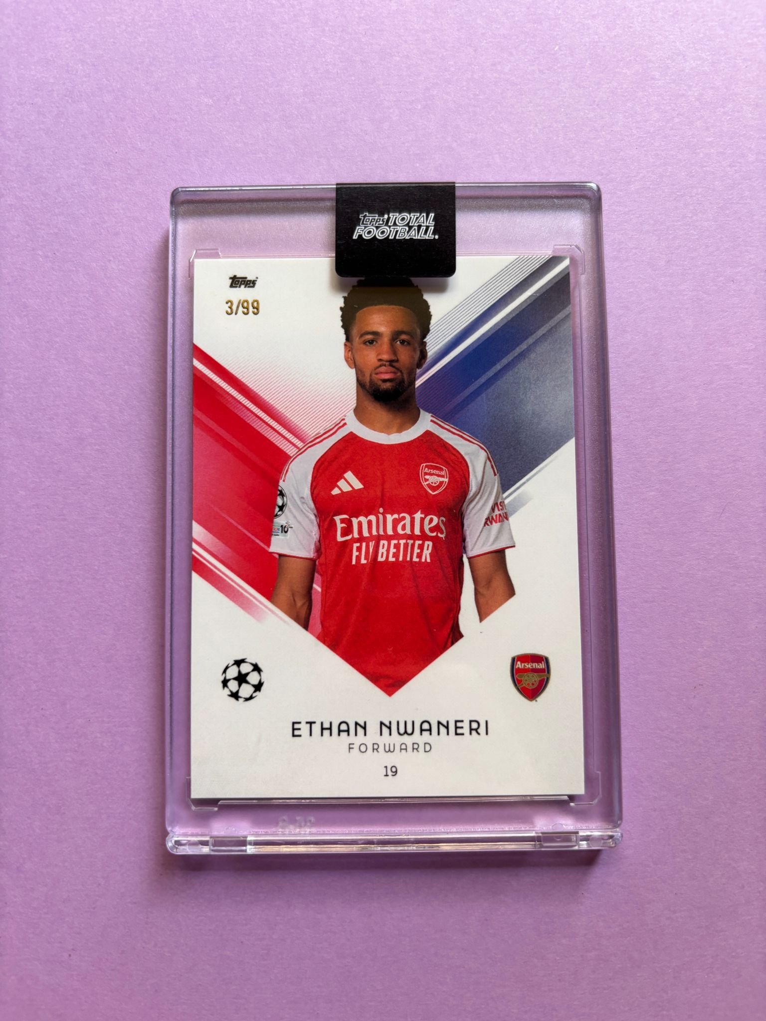 Carta de Topps Total Football BASE SET en su Metacrilato en perfecto estado, del jugador Ethan Nwaneri en el Arsenal en la temporada 2025/2026 en su versión Base Set con su numeración 3/99.