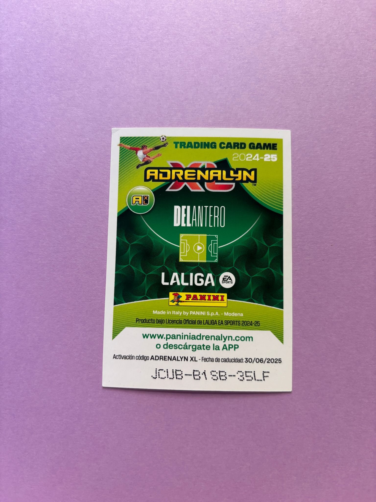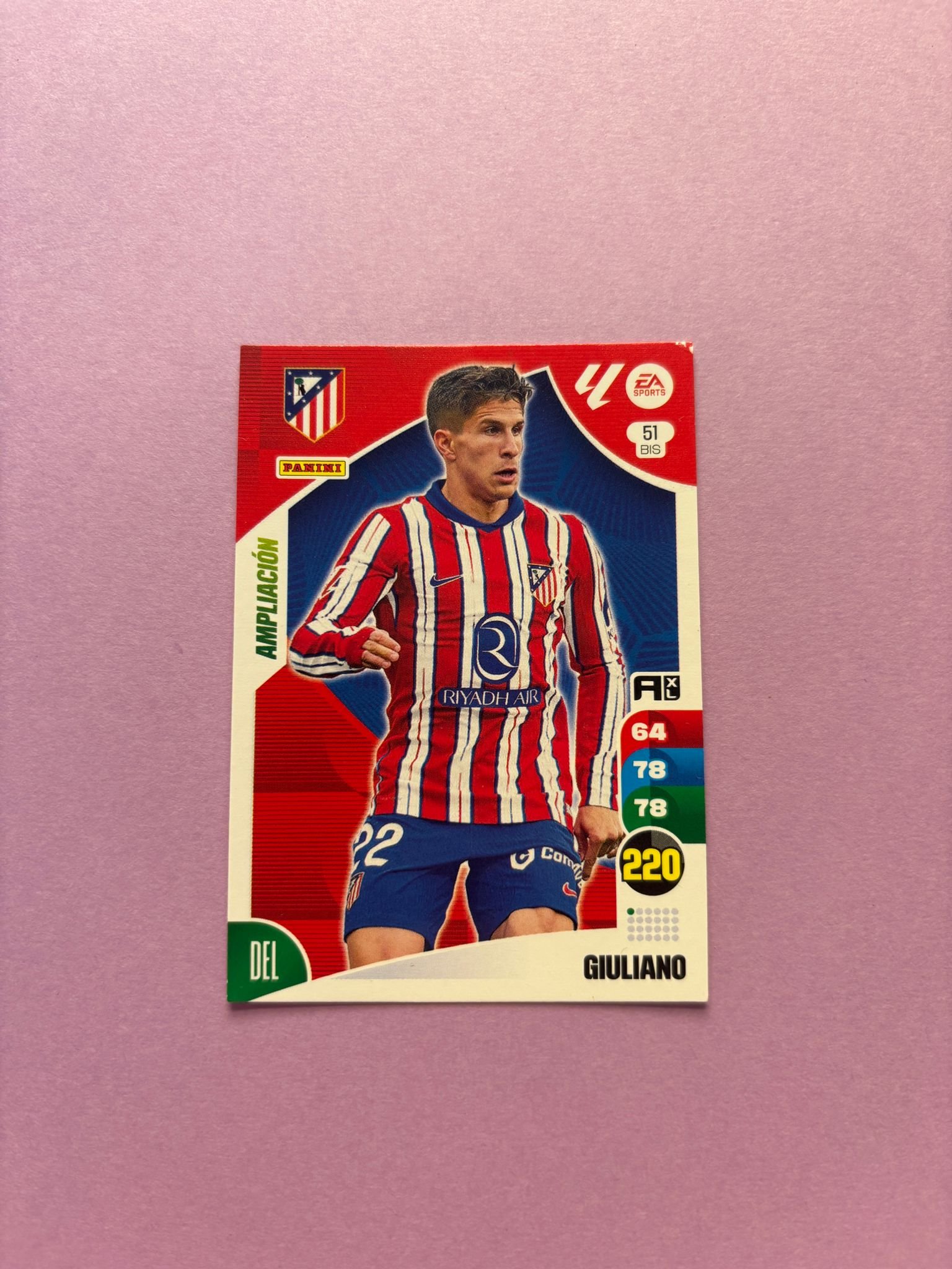 Carta de Adrenalyn Xl en su Sleeve en perfecto estado, del jugador Giuliano Simeone en el Atlético de Madrid en la temporada 2024/2025 en su versión Ampliación.