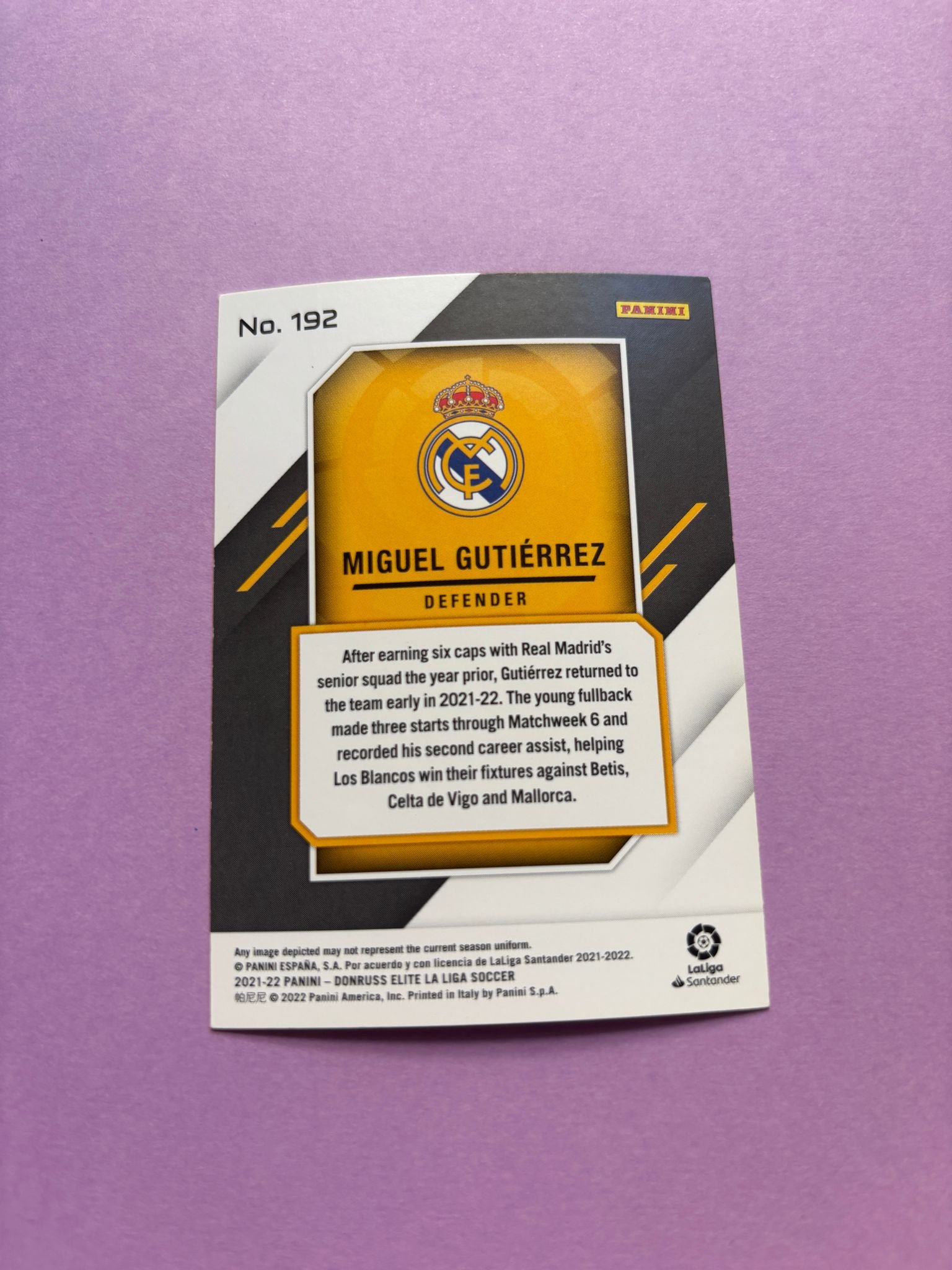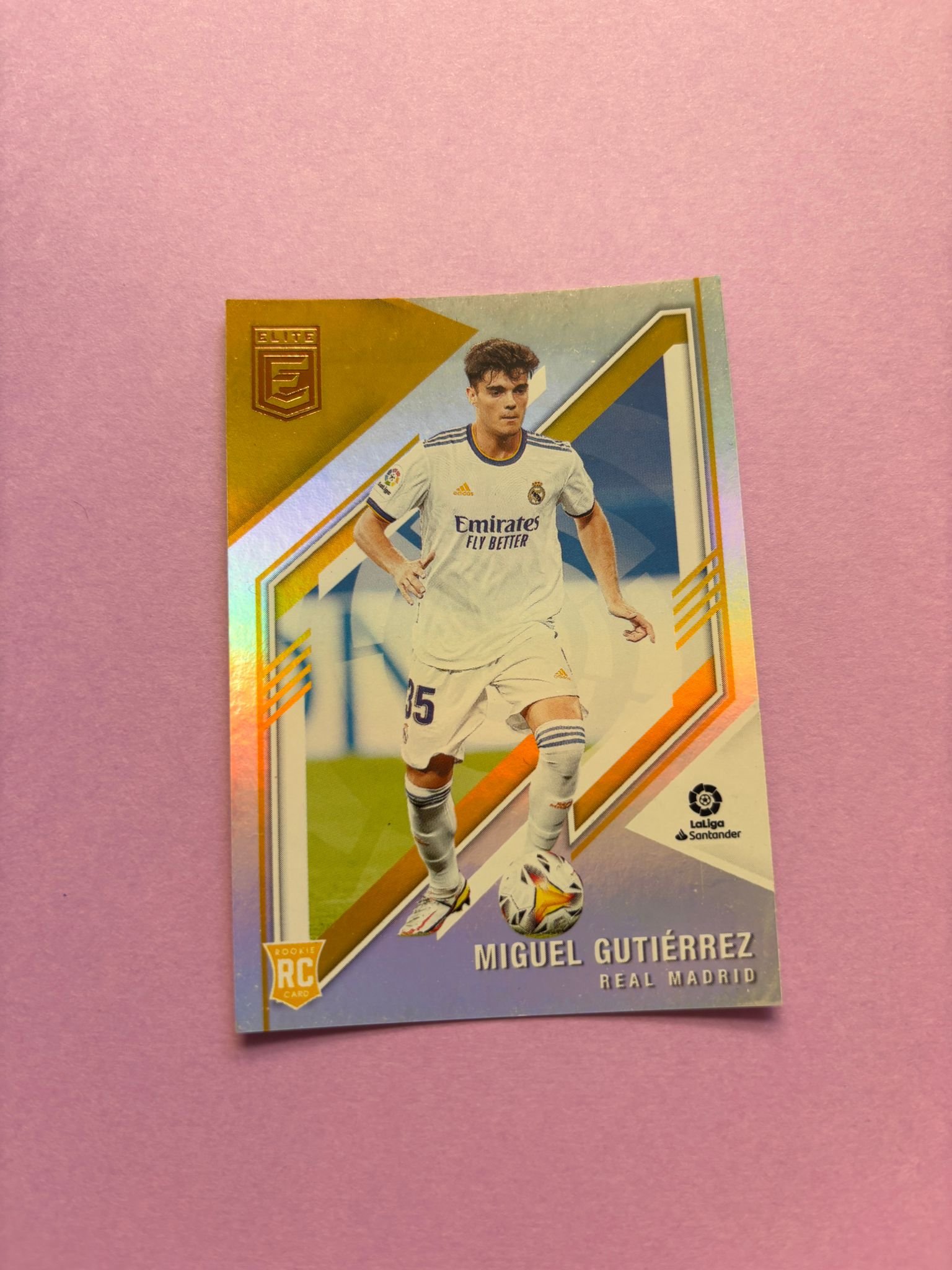 Carta de Panini Donruss Elite La Liga en su Sleeve en perfecto estado, del jugador Miguel Gutiérrez en el Real Madrid en la temporada 2021/2022 en su edición especial Base.