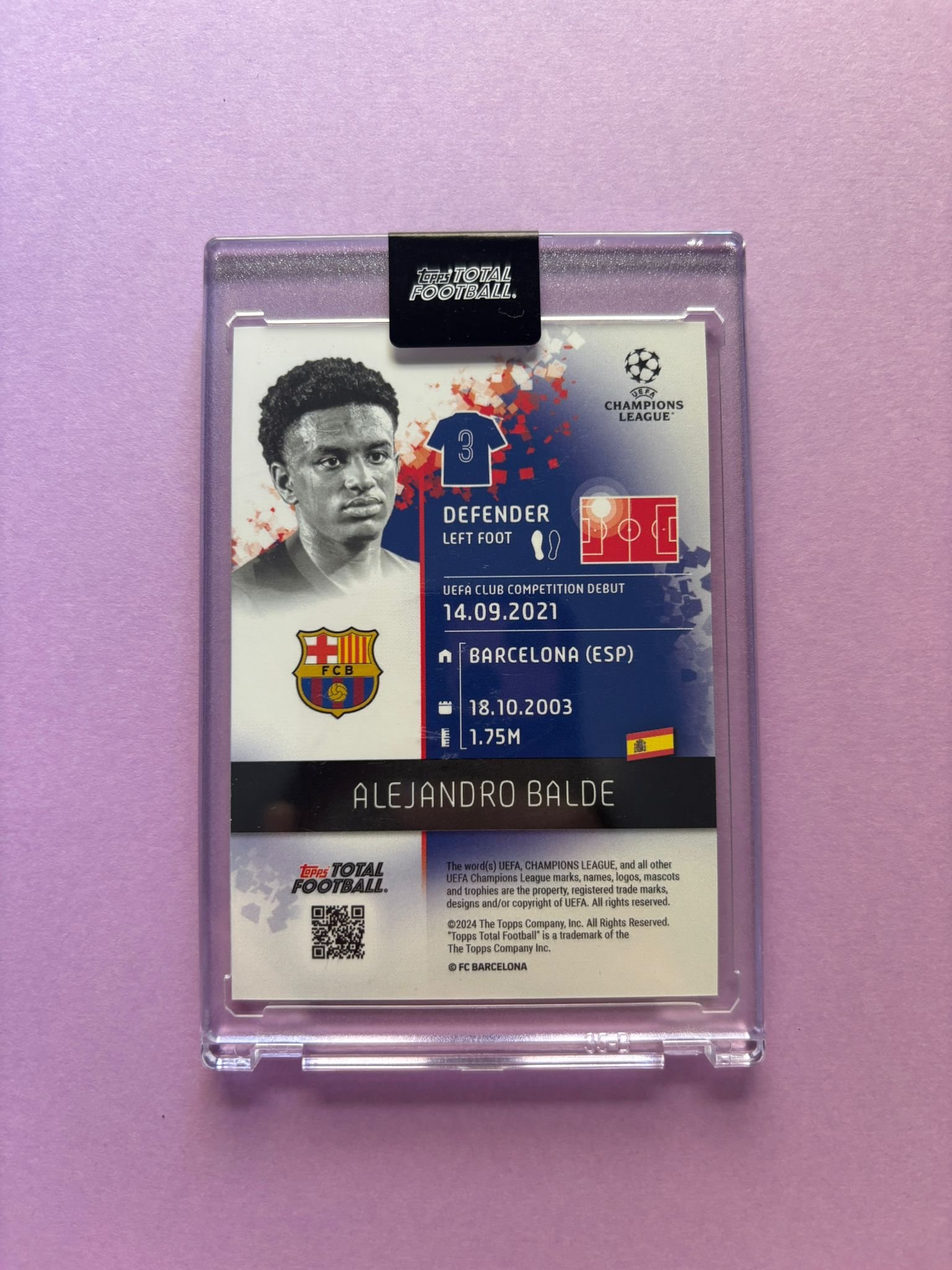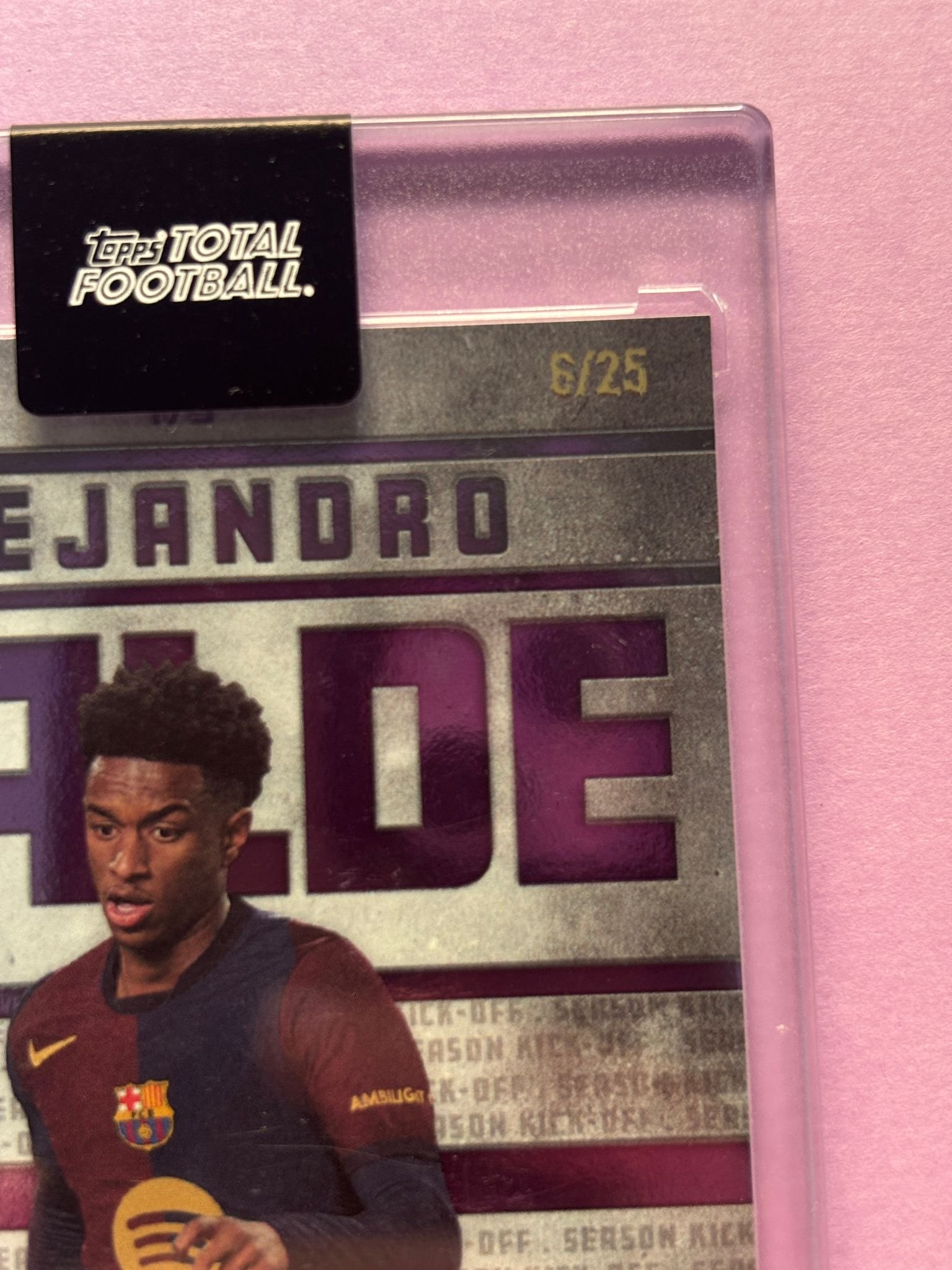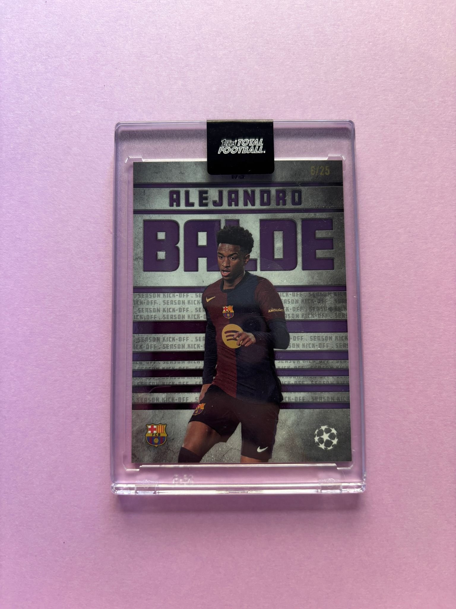 Carta de Topps Total Football en su Metacrilato en perfecto estado, del jugador Alejandro Balde en el Barcelona en la temporada 2024/2025 en su versión SEASON KICK OFF con la numeración 06/25.