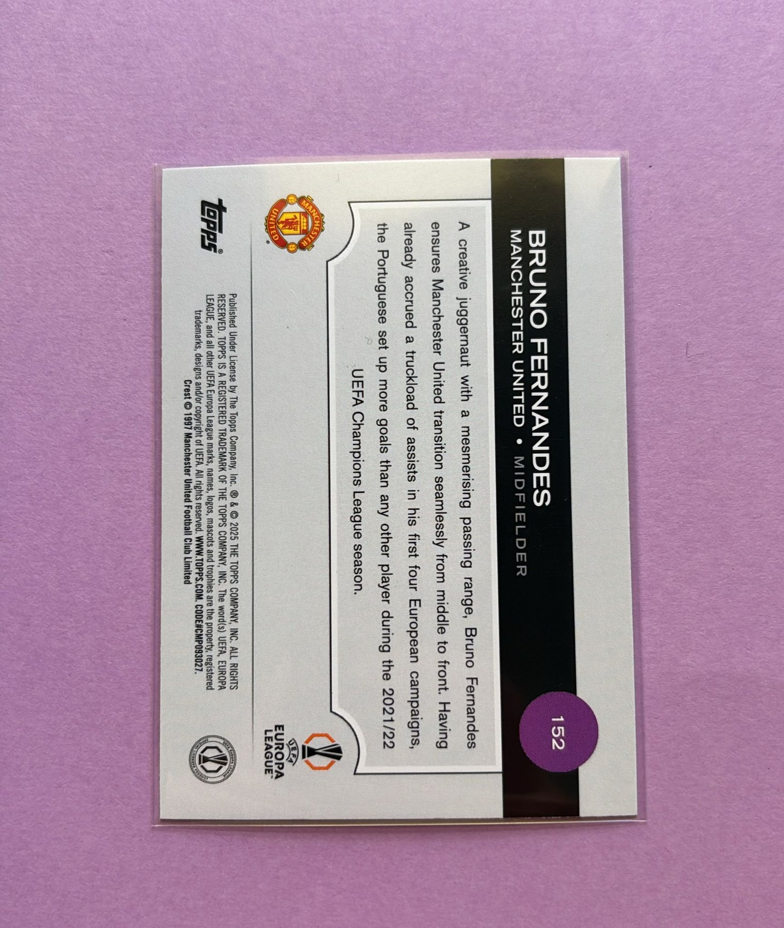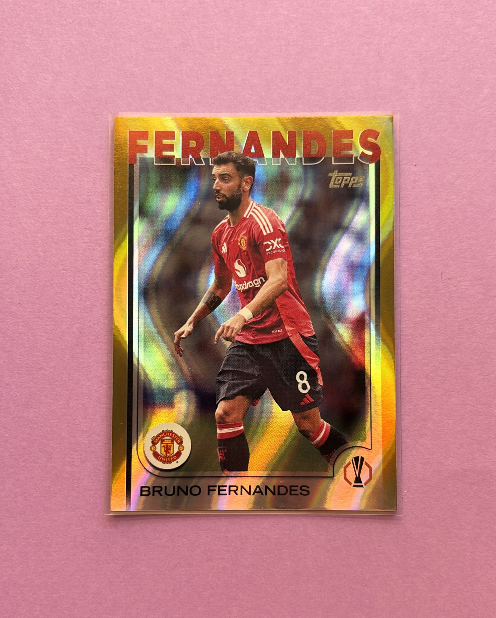 Carta de Topps UEFA Club Competitions en su Sleeve en perfecto estado, del jugador Bruno Fernandes en el Manchester United en la temporada 2024/2025 en su edición especial Gold Flowfractor.