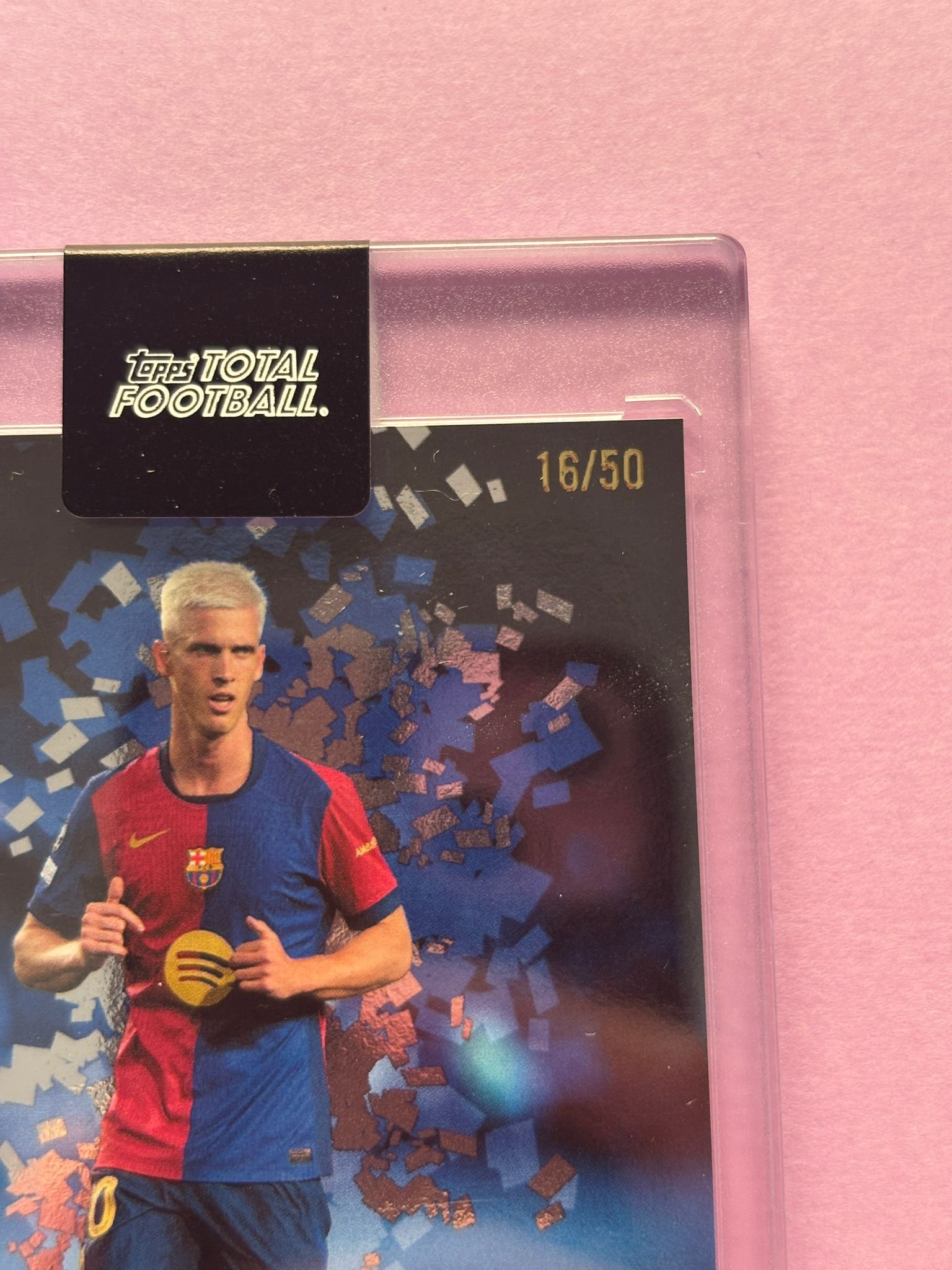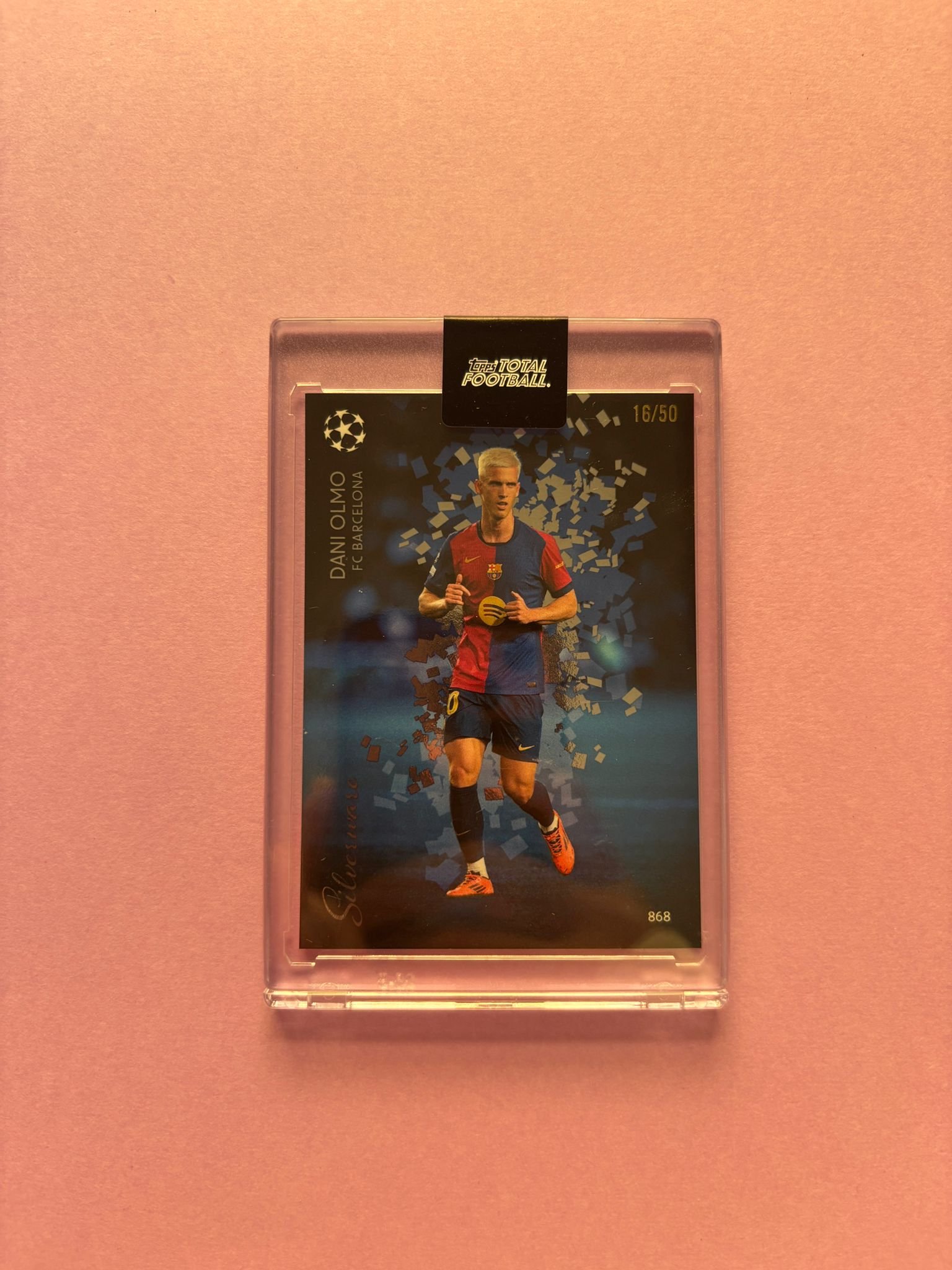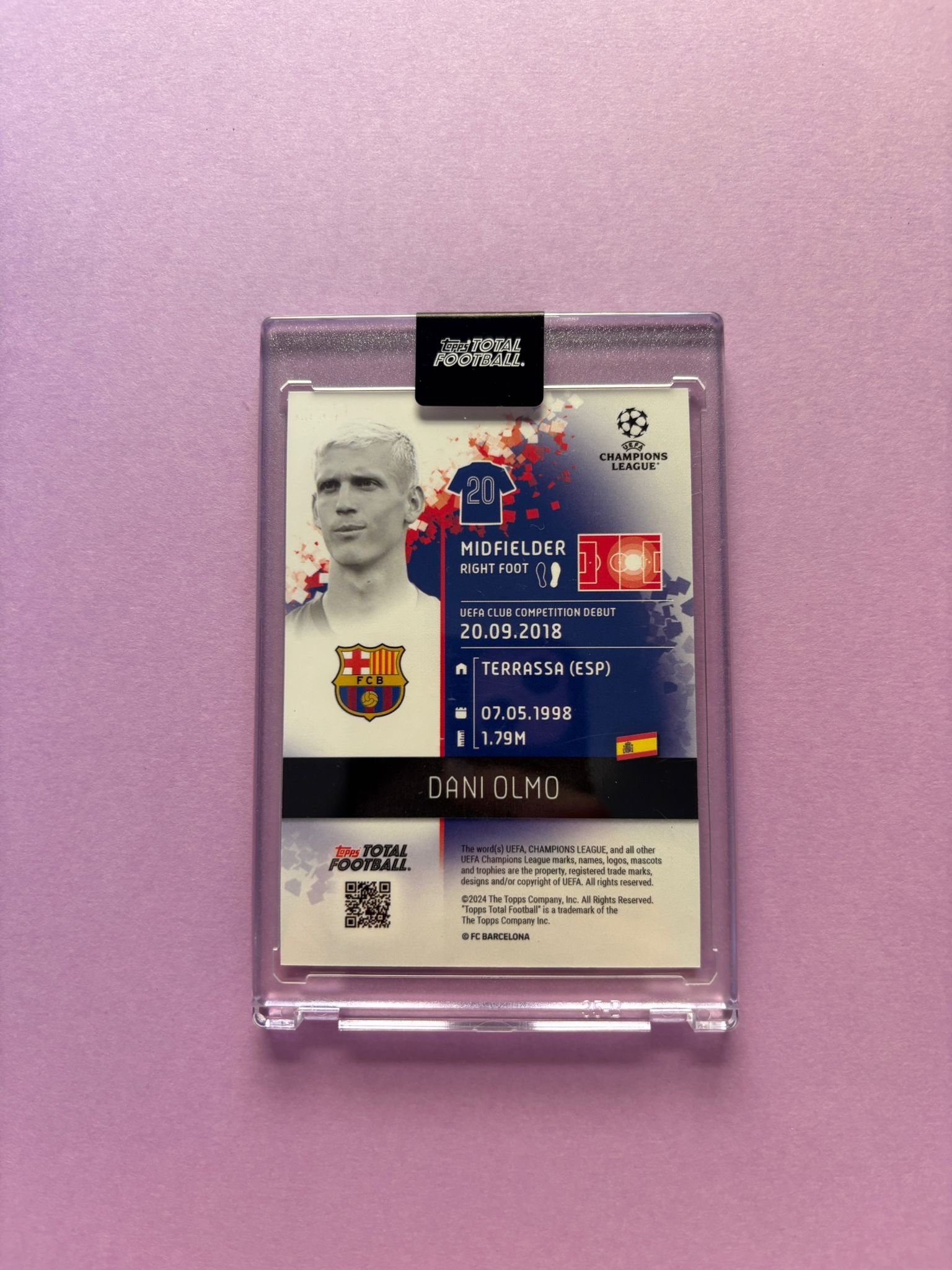Carta de Topps Total Football en su Metacrilato en perfecto estado, del jugador Dani Olmo en el Barcelona en la temporada 2024/2025 en su versión SILVERWARE con la numeración 16/50.