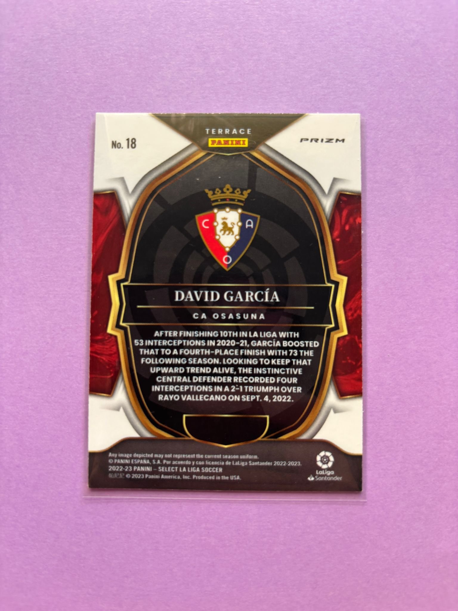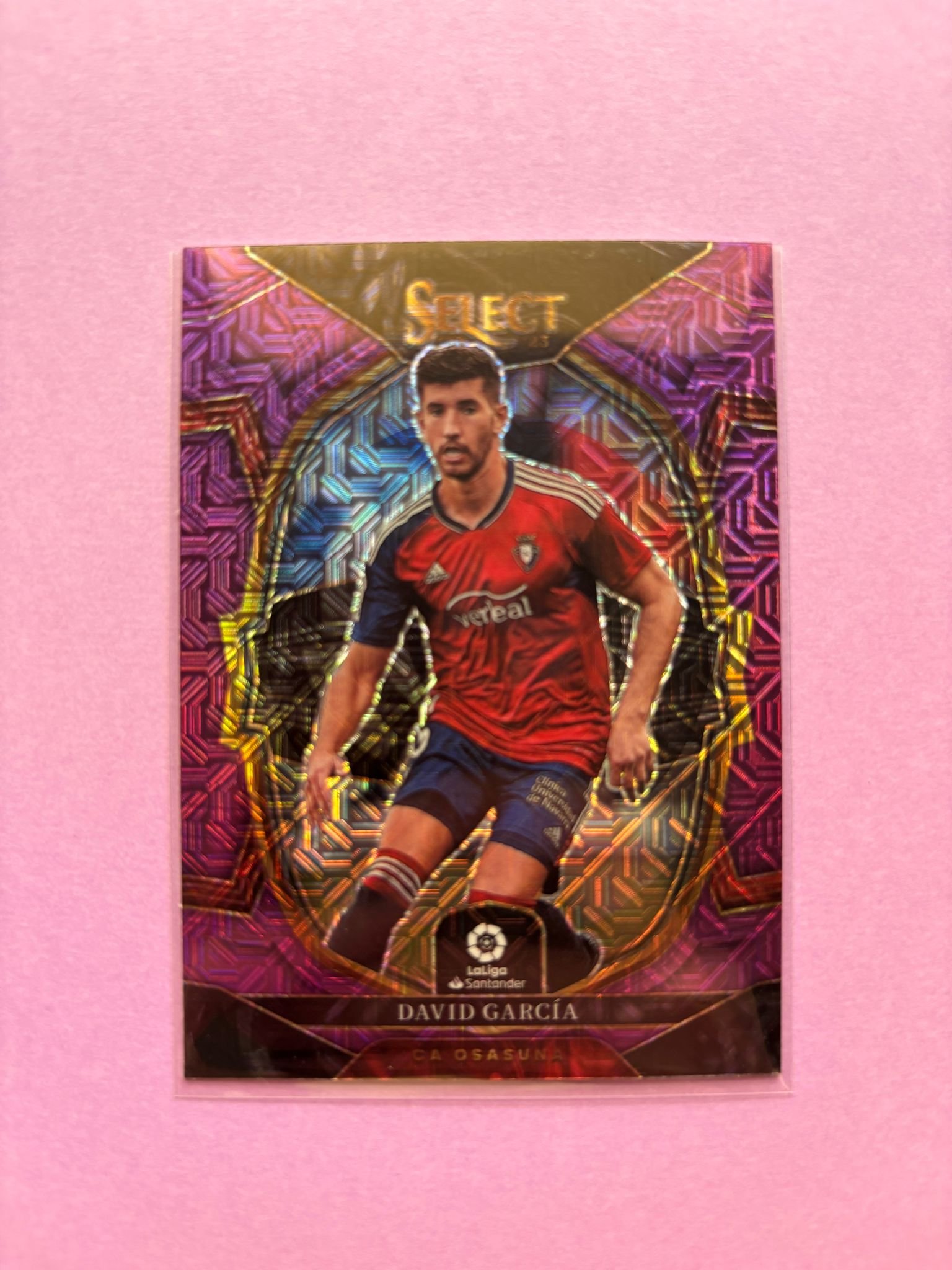 Carta de Panini Select La Liga en su Sleeve en perfecto estado, del jugador David García en el CA Osasuna en la temporada 2022/2023 en su versión Purple Mojo Prizm.