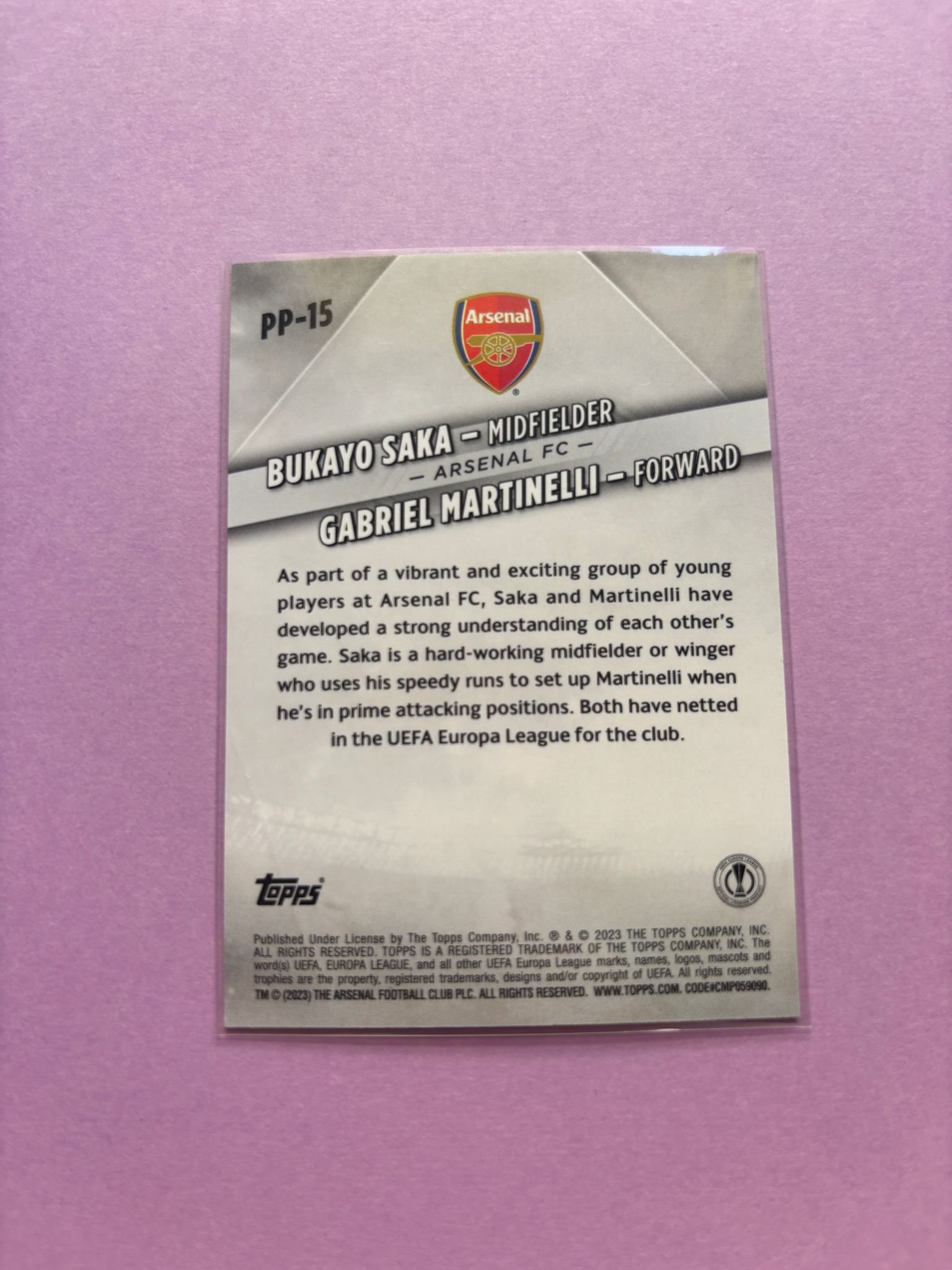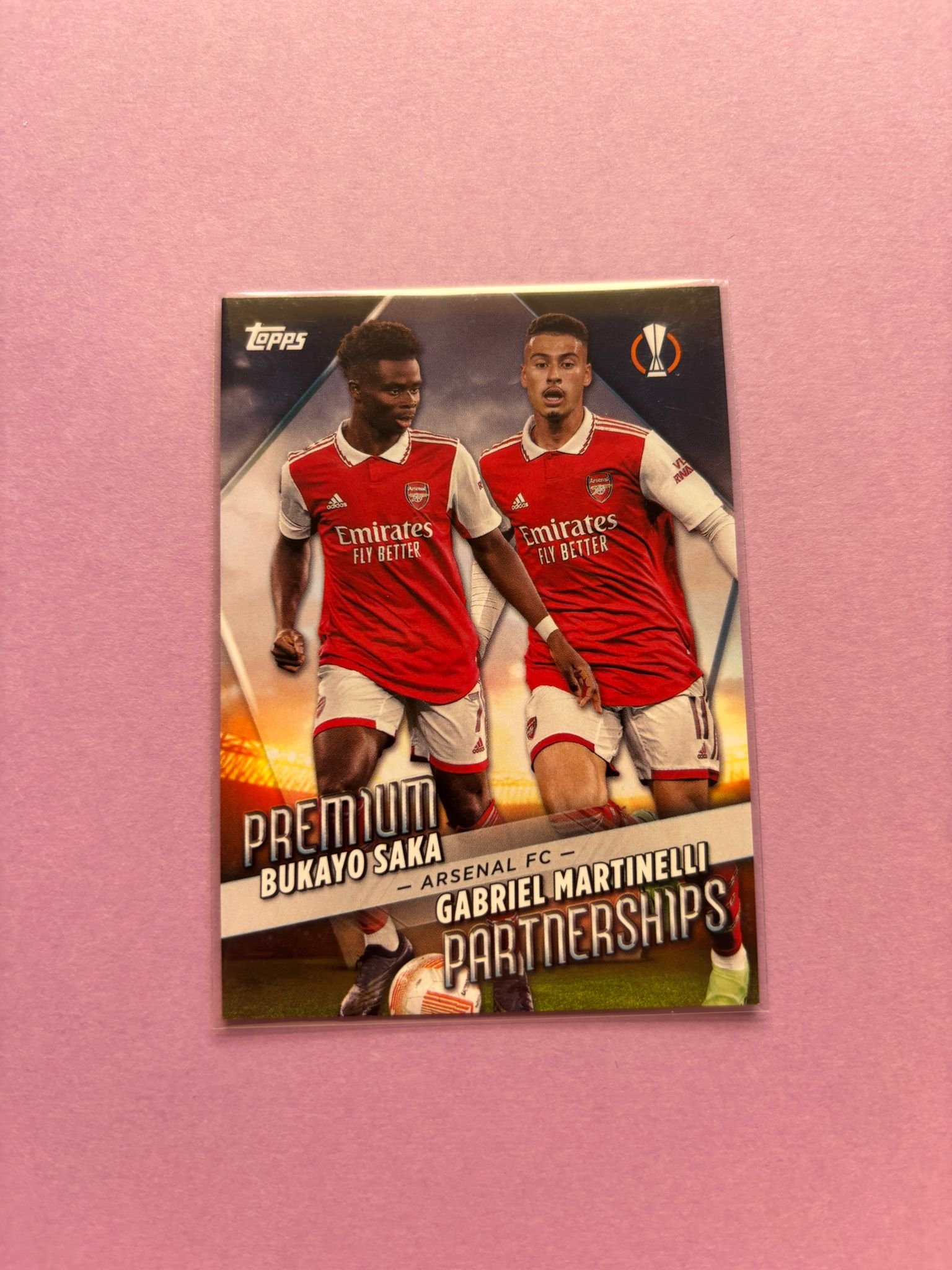 Carta de Topps Uefa Club Competitions en su Sleeve en perfecto estado, de los jugadores Gabriel Martinelli y Bukayo Saka en el Arsenal en la temporada 2022/2023 en su versión Premium Partnerships.