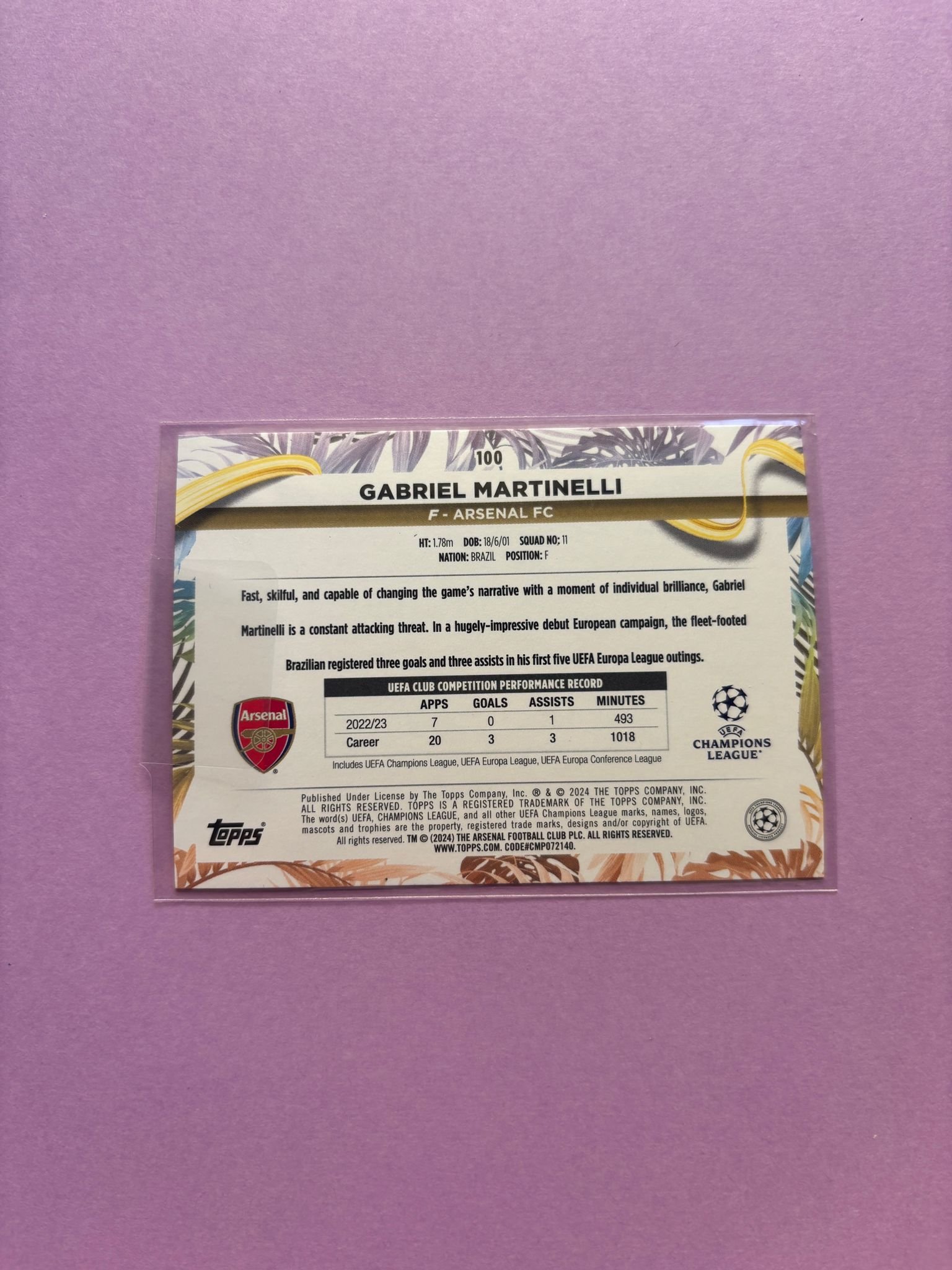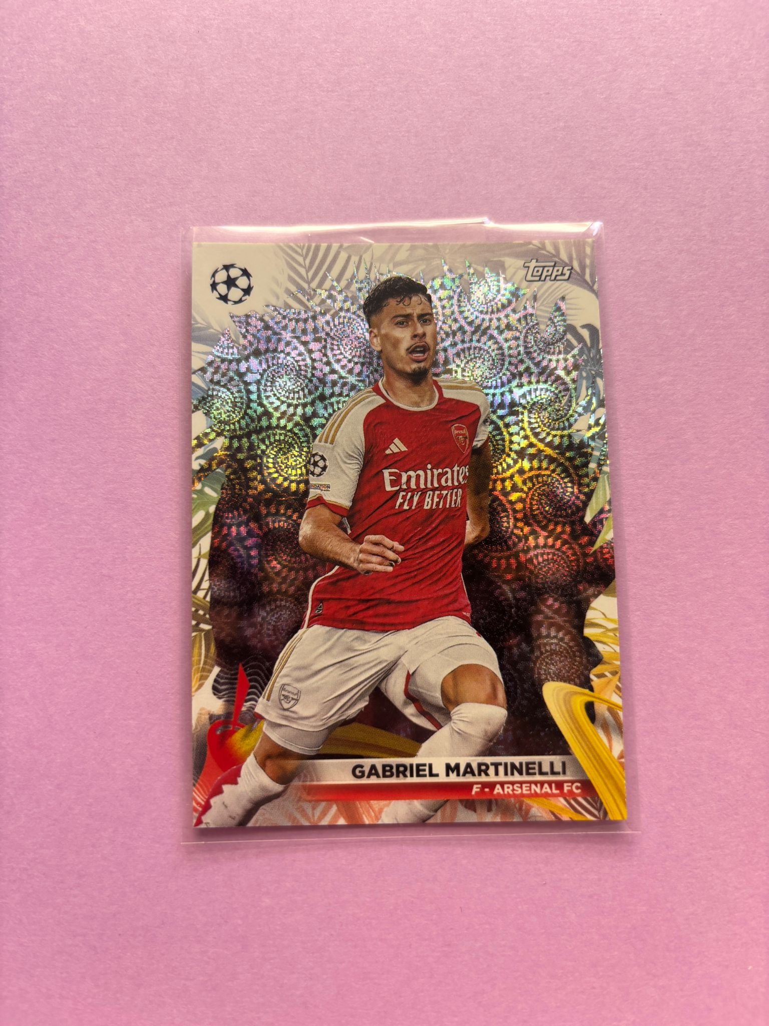 Carta de Topps Carnaval Edition UEFA Club Competitions en su Sleeve en perfecto estado, del jugador Gabriel Martinelli en el Arsenal en la temporada 2023/2024 en su versión Carnaval.