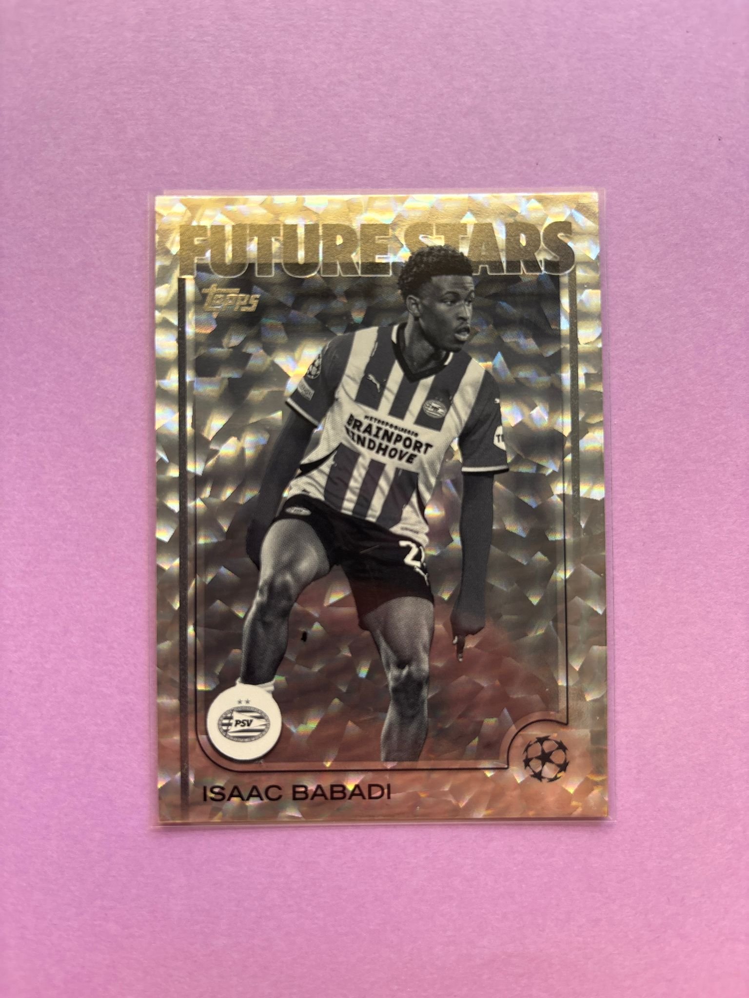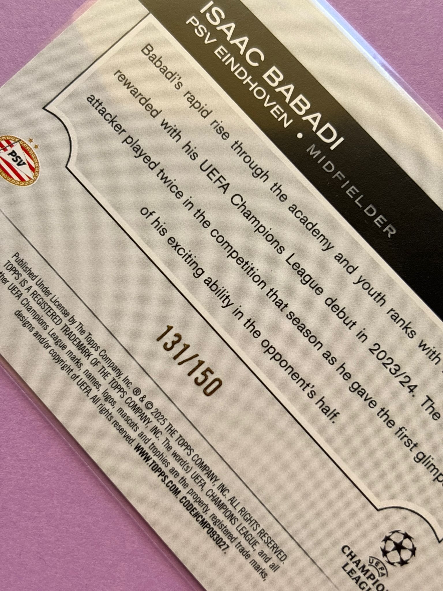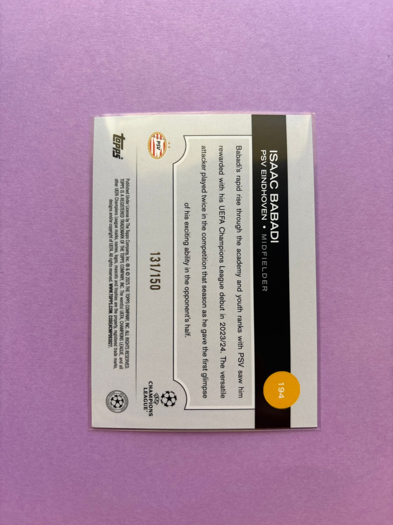 Carta de Topps UEFA Club Competitions en su Sleeve en perfecto estado, del jugador Isaac Babadi en el PSV Eindhoven en la temporada 2024/2025 en su edición especial Icy Black & White con numeración 131/150.