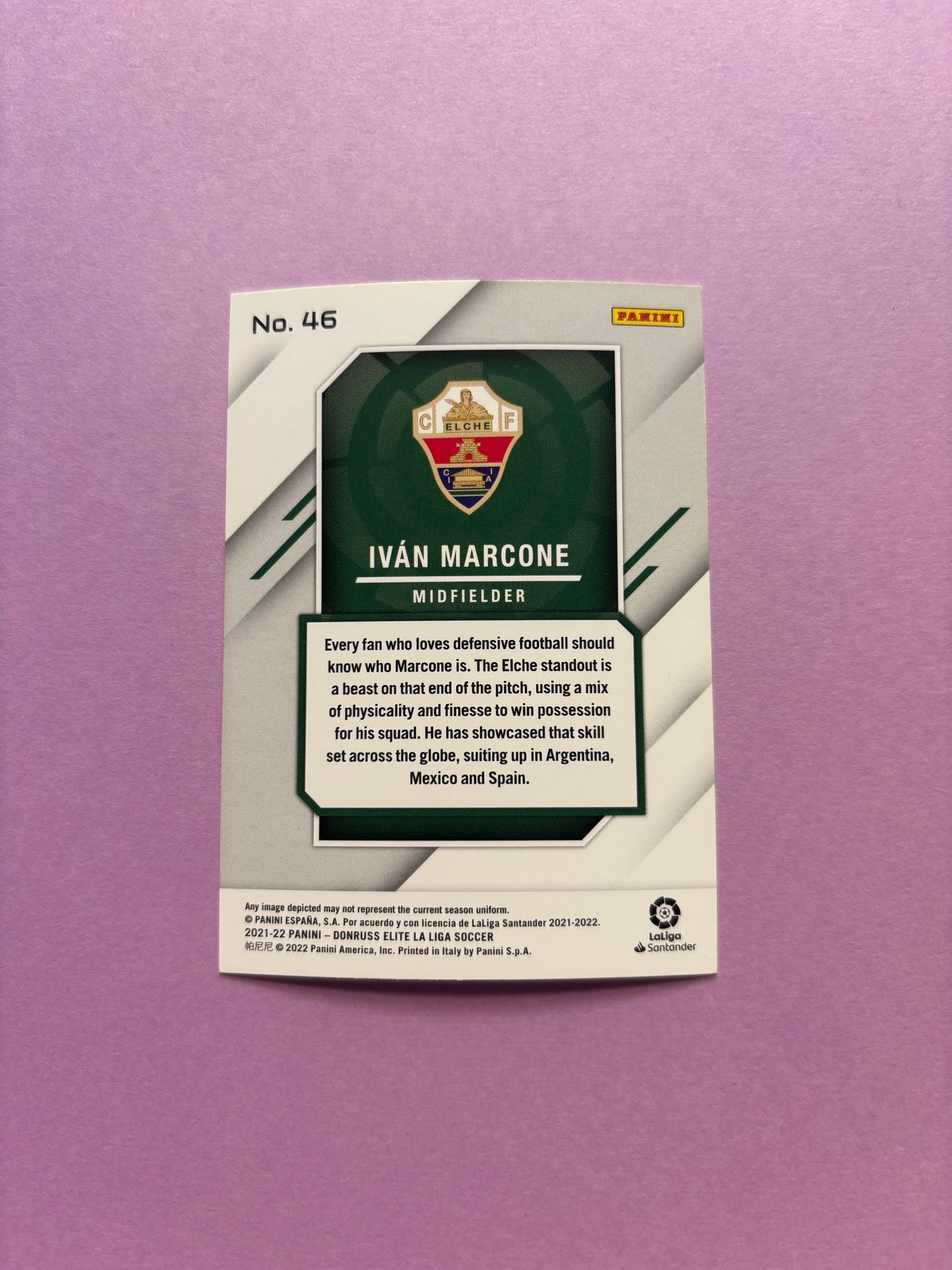 Carta de Panini Donruss Elite La Liga en su Sleeve en perfecto estado, del jugador Iván Marcone en el Elche CF en la temporada 2021/2022 en su edición especial Base.