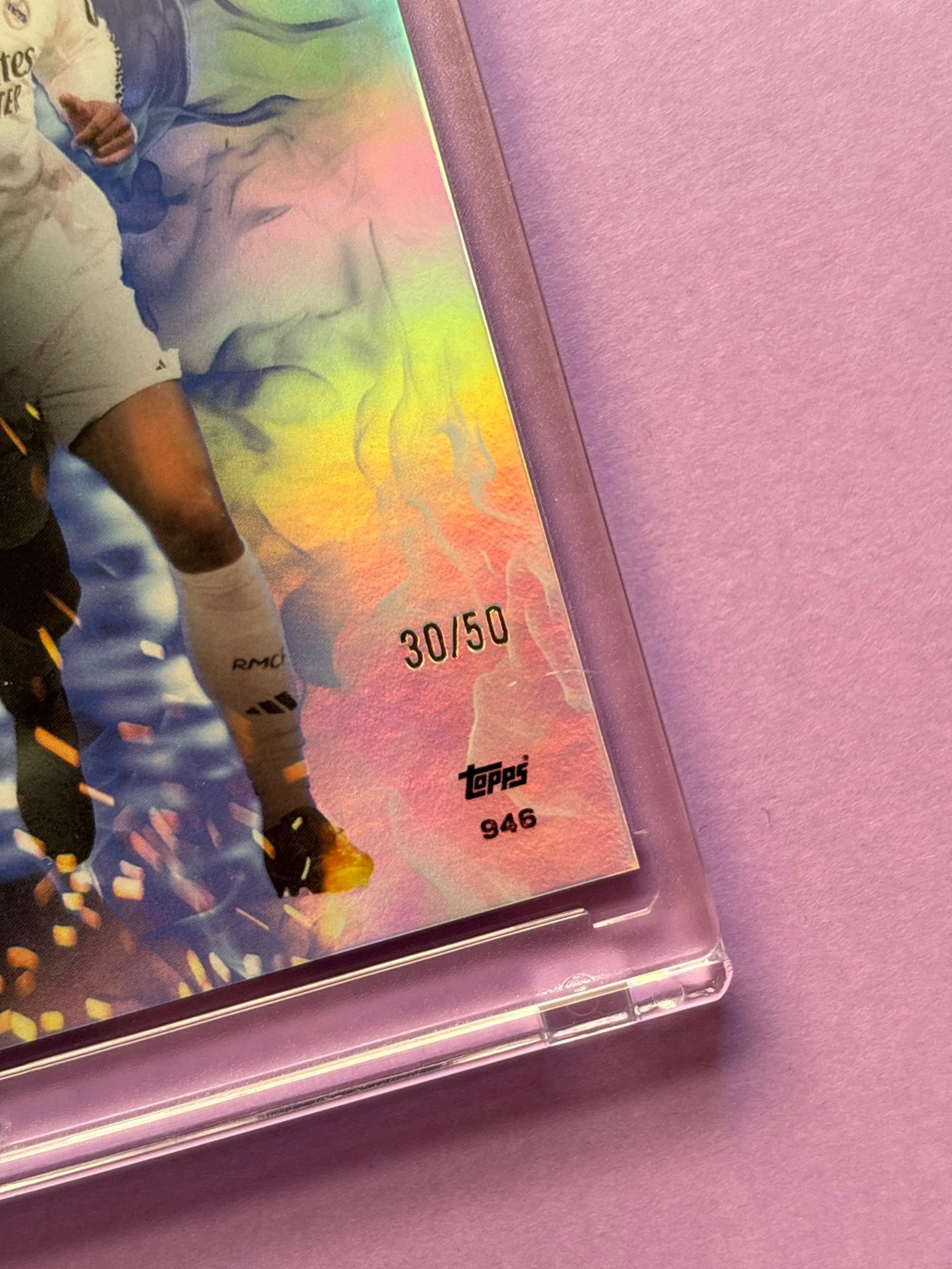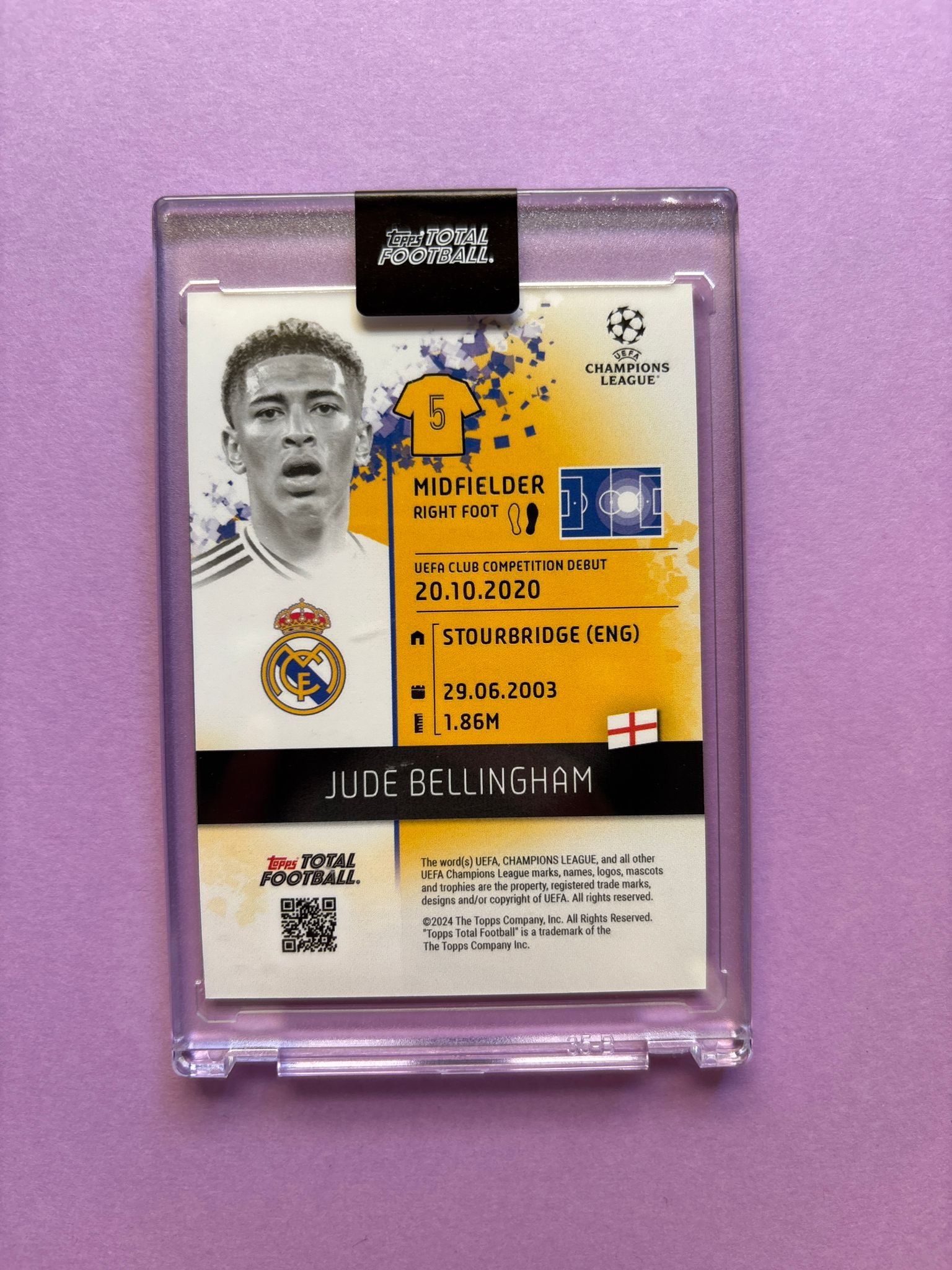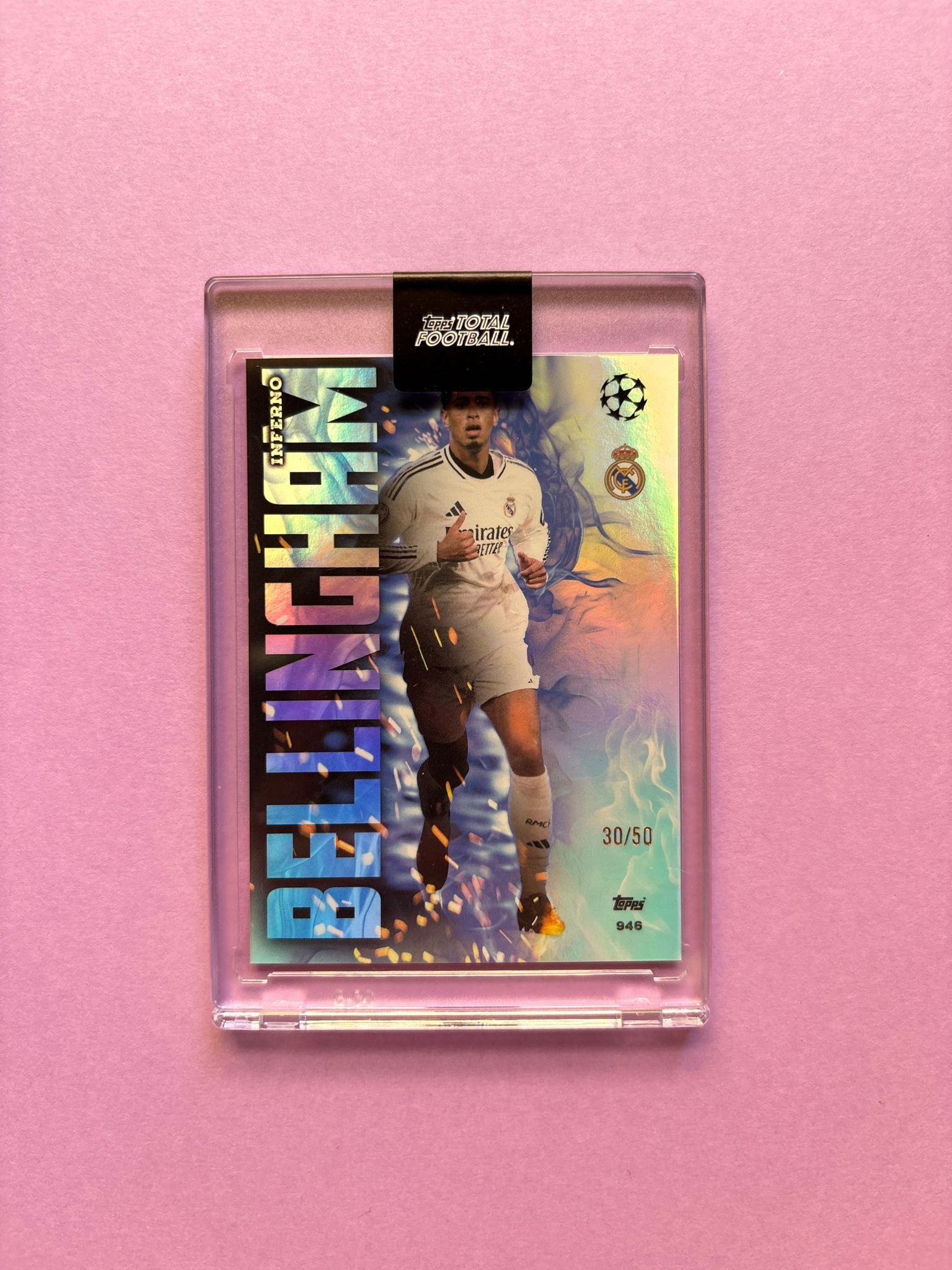 Carta de Topps Total Football en su TopLoader en perfecto estado, del jugador Jude Bellingham en el Real Madrid en la temporada 2024/2025 en su versión Inferno con la numeración 30/50.