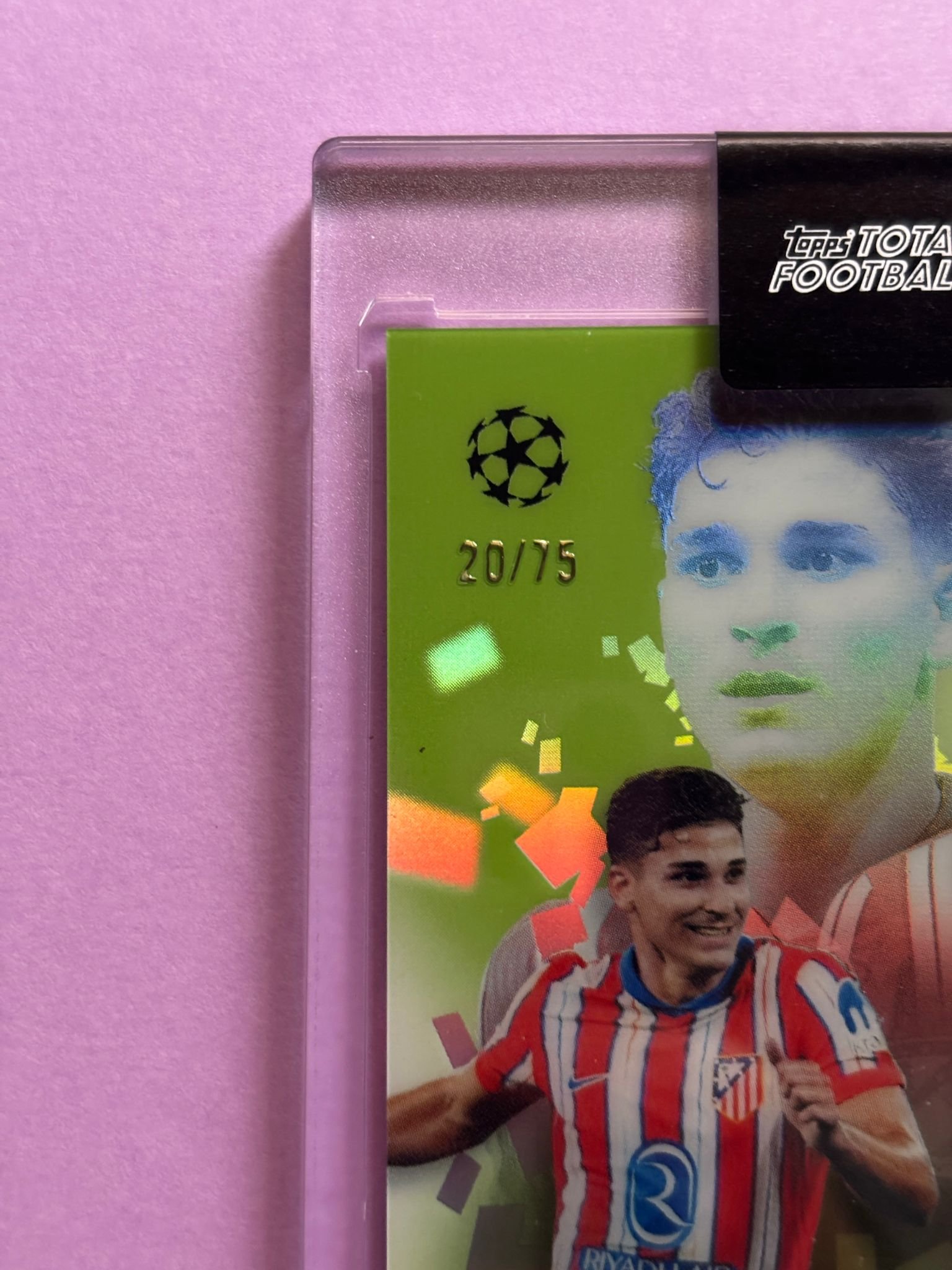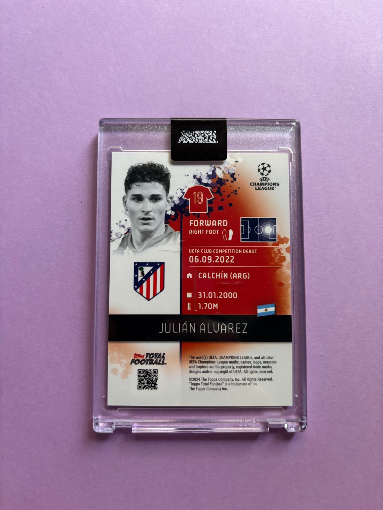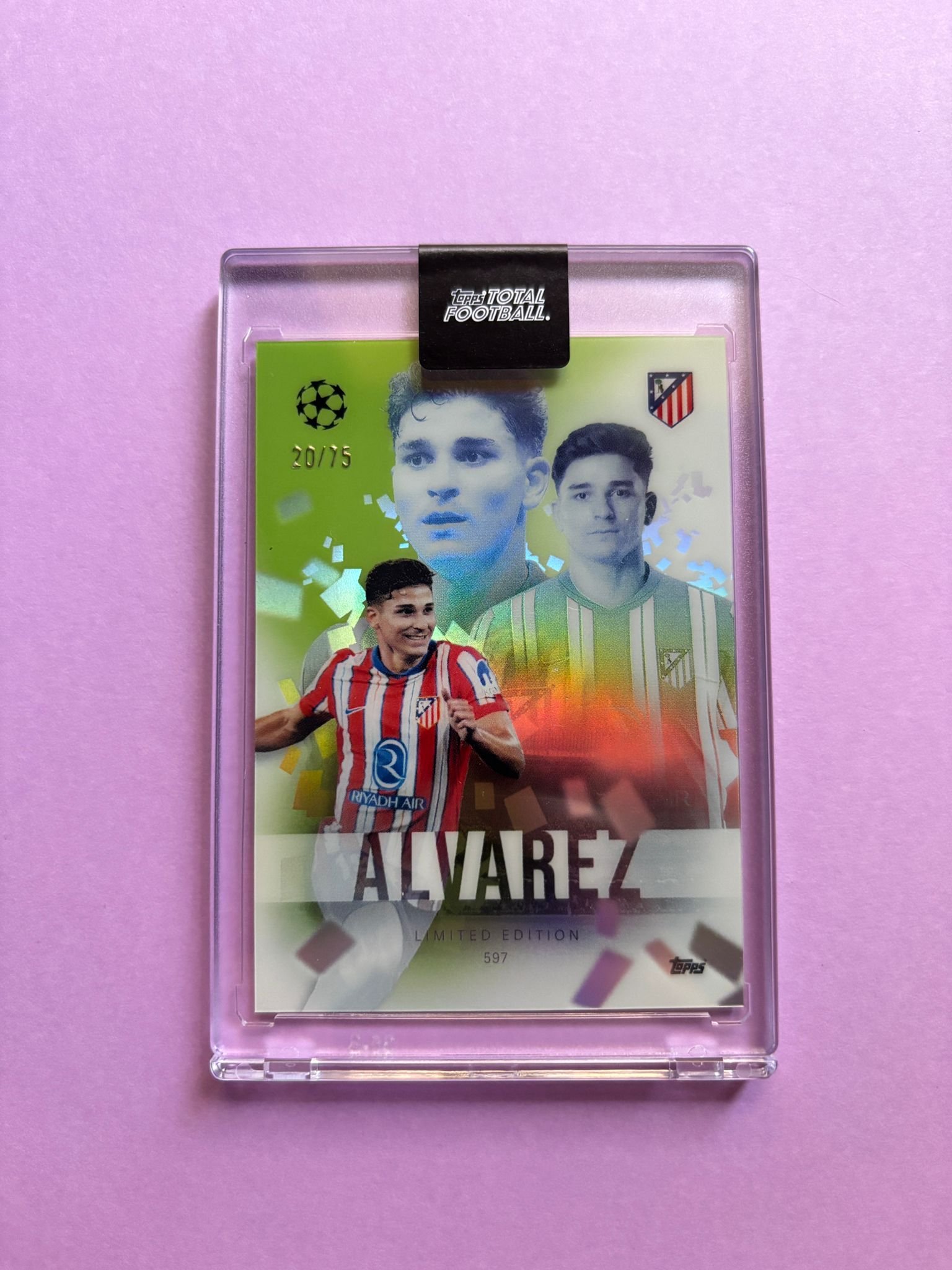 Carta de Topps Total Football en su Metacrilato en perfecto estado, del jugador Julián Álvarez en el Atlético de Madrid en la temporada 2024/2025 en su versión LIMITED EDITION con su numeración 20/75.