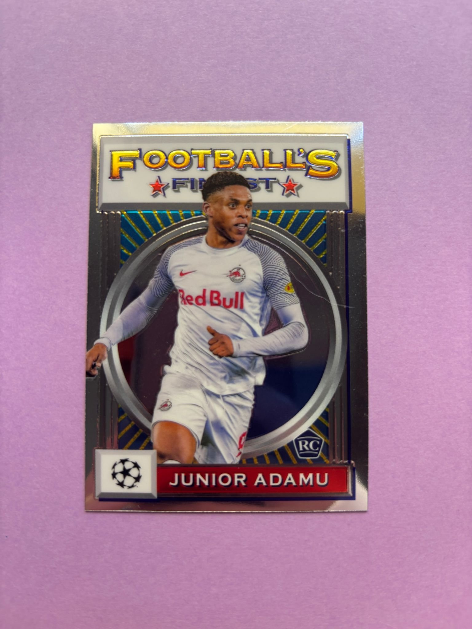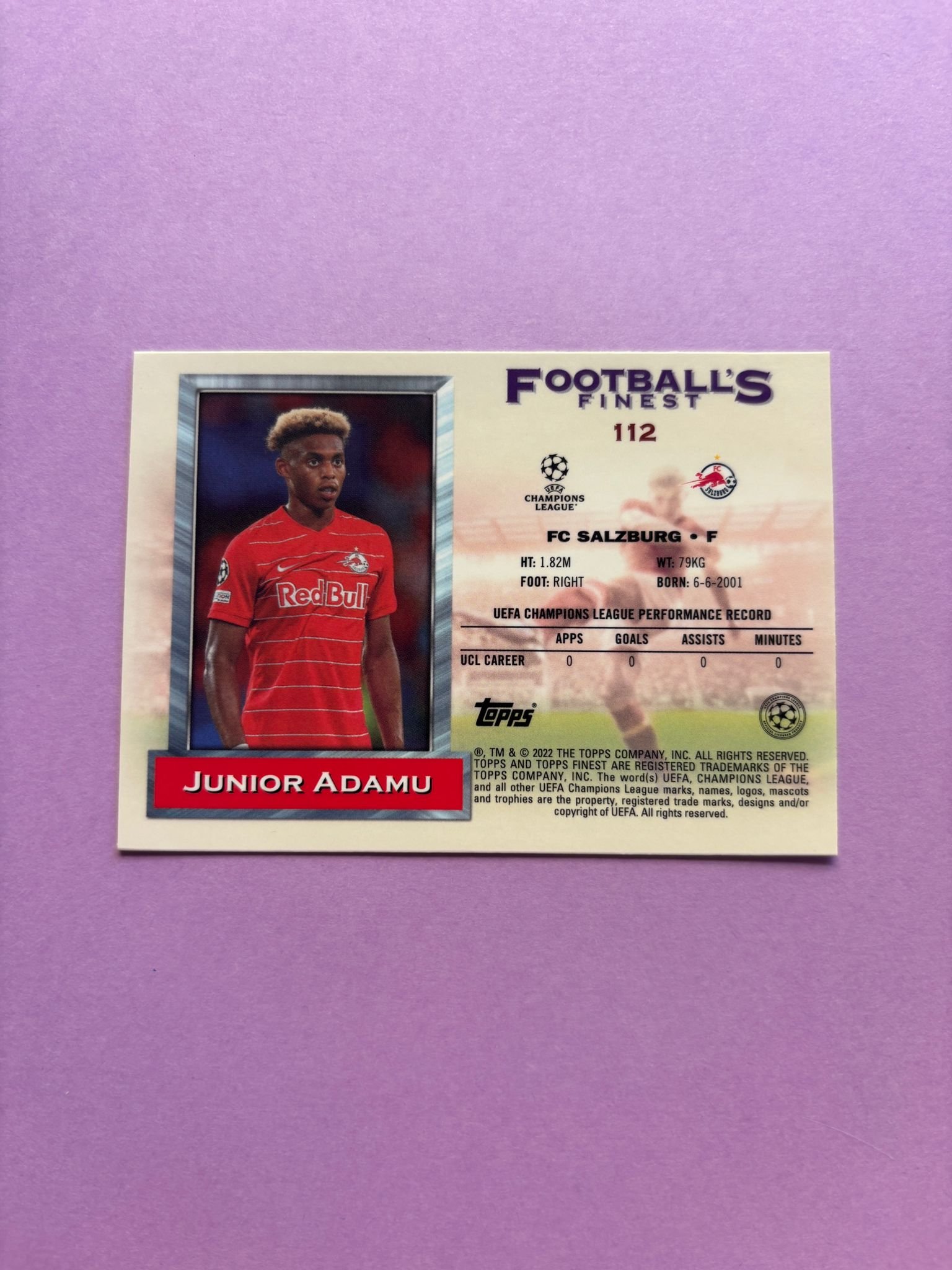 Carta de Topps Finest Flashbacks UCL en su Sleeve en perfecto estado, del jugador Junior Adamu en el Red Bull Salzburgo en la temporada 2021/2022 en su edición especial Base.