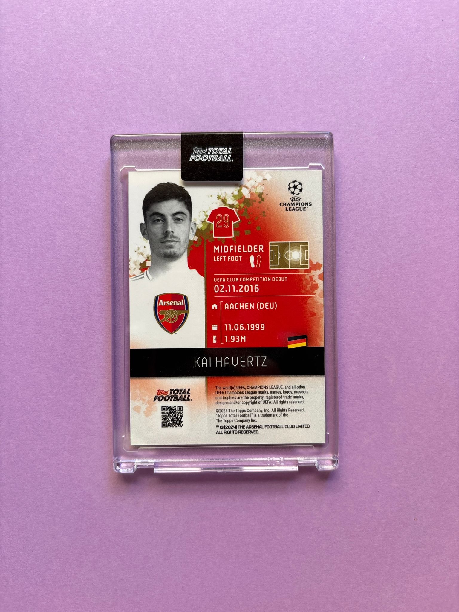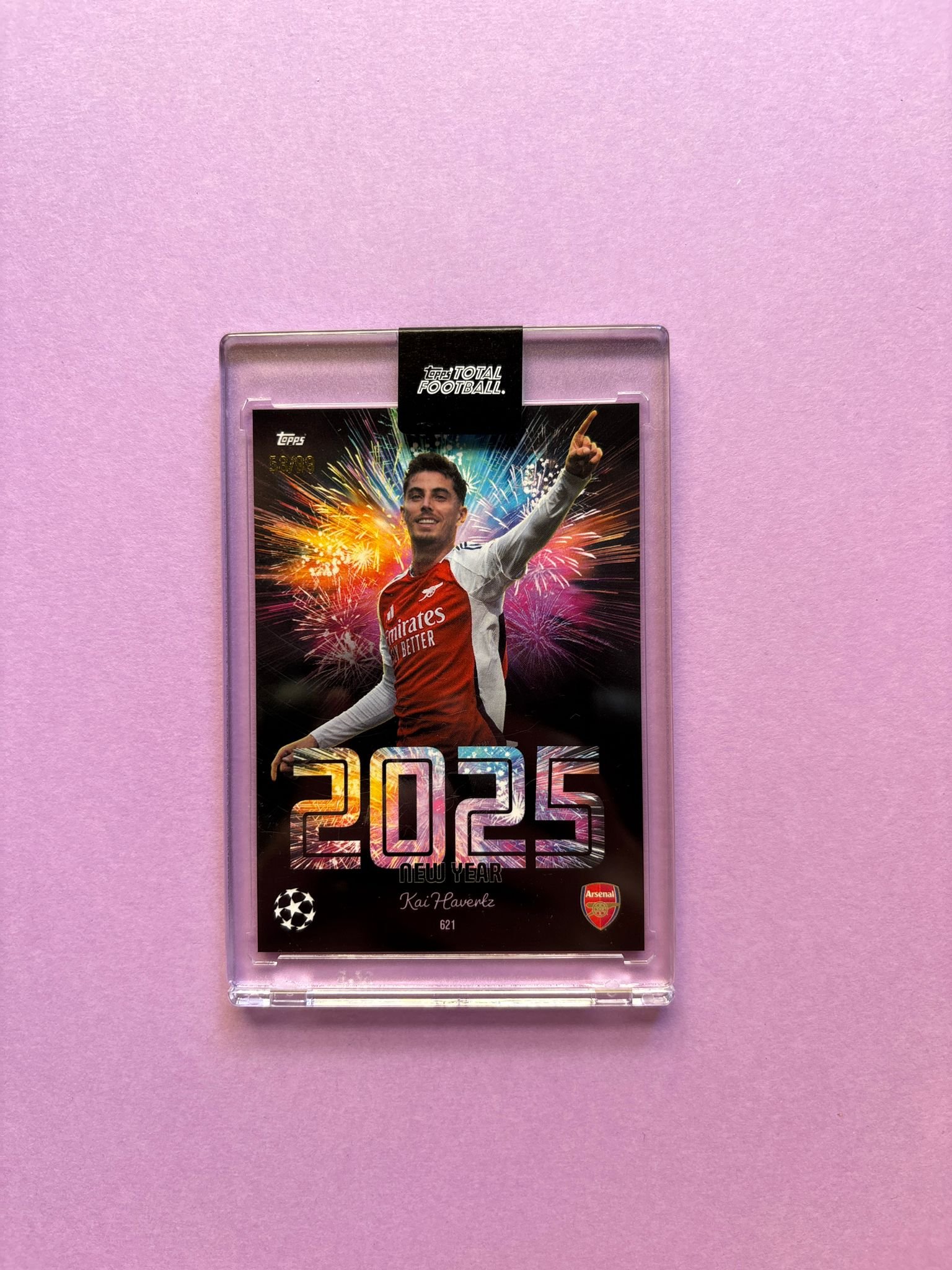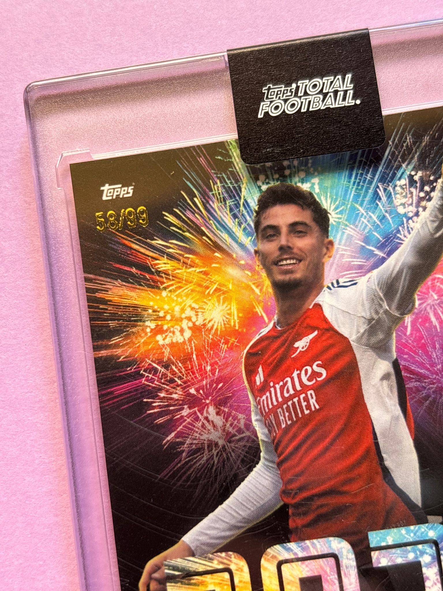 Carta de Topps Total Football BASE SET en su Metacrilato en perfecto estado, del jugador Kai Havertz en el Arsenal en la temporada 2024/2025 en su versión New Year con su numeración 68/99.