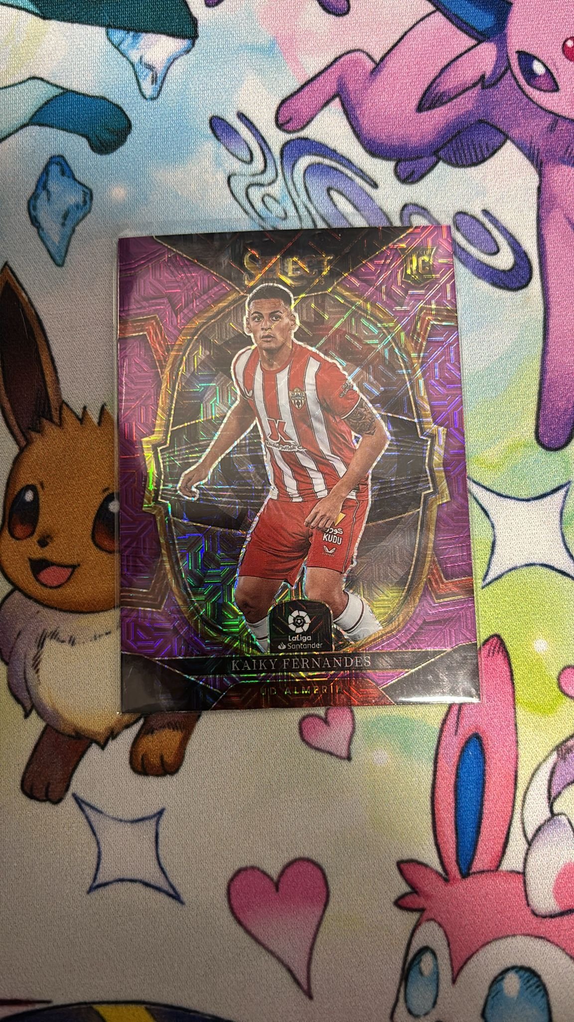 Carta de Panini Select en su Sleeve en perfecto estado, del jugador Kaiky Fernandes en el UD Almería en la temporada 2022/2023 en su versión Purple Mojo.