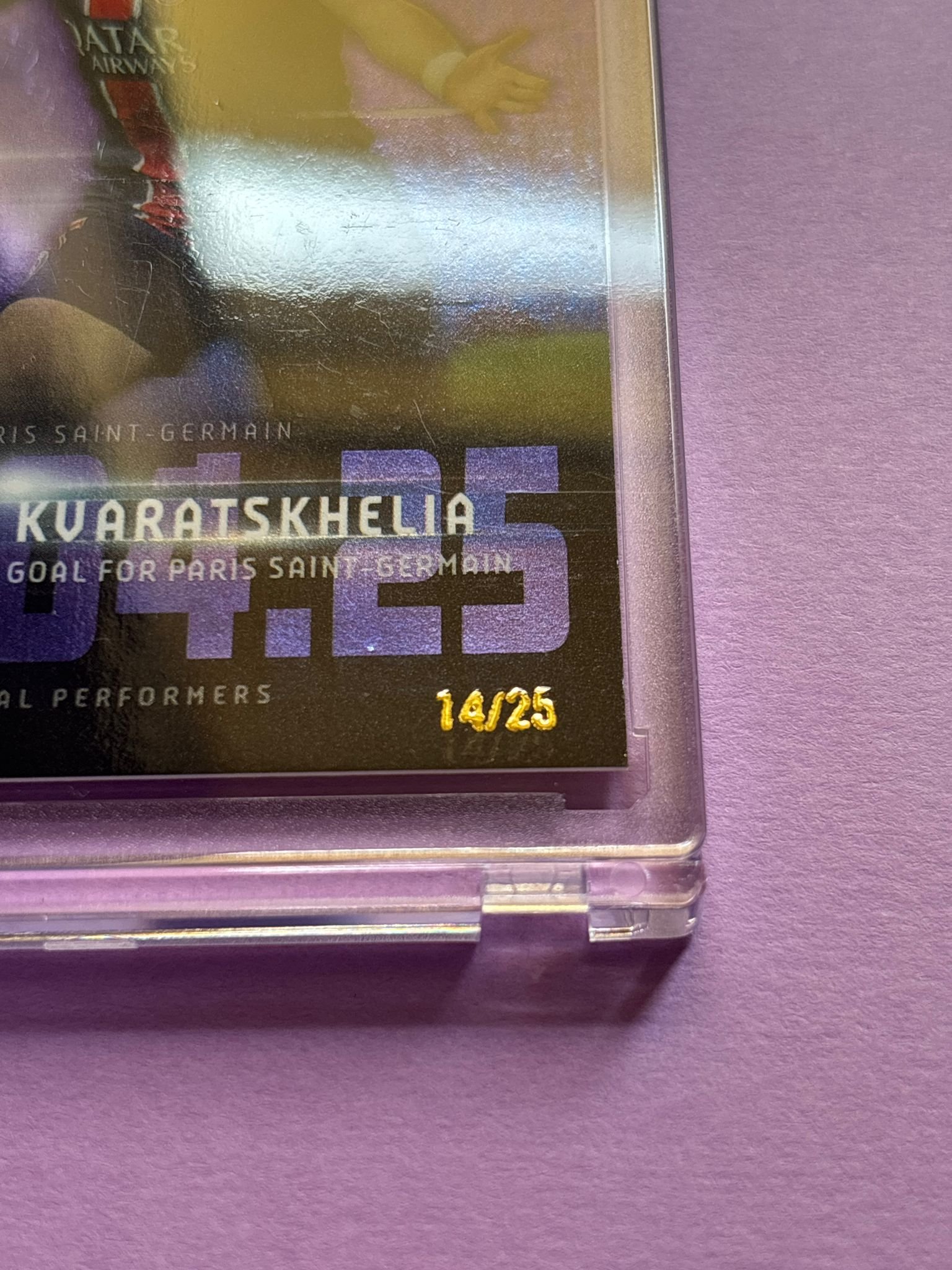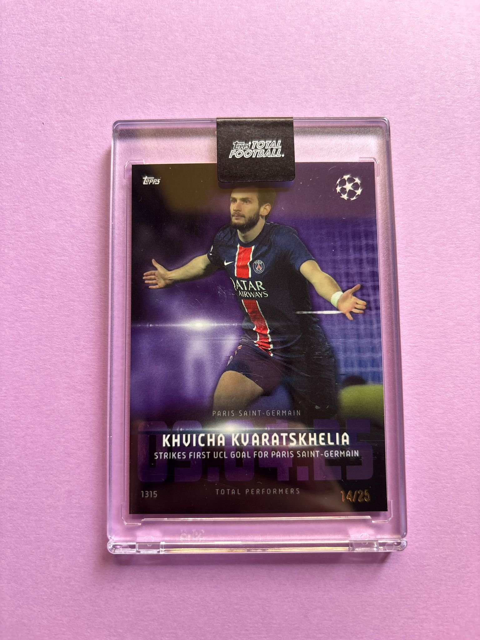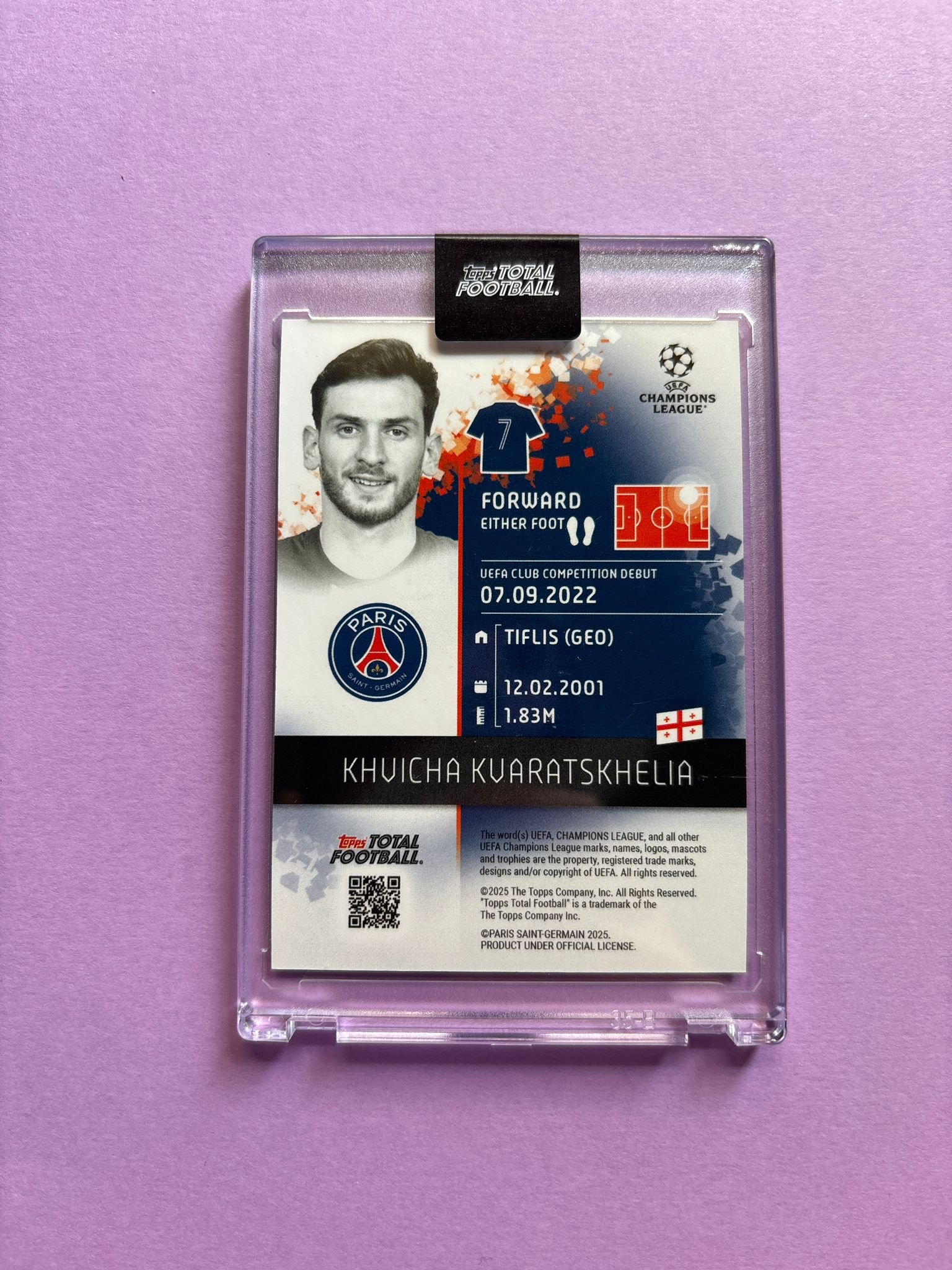 Carta de Topps Total Football en su metacrilato en perfecto estado, del jugador KVICHA KVARASKHELIA en el PSG en la temporada 2024/2025, solamente numerada a 25.