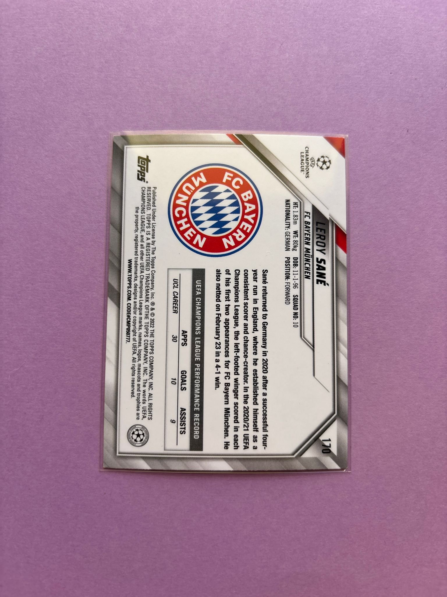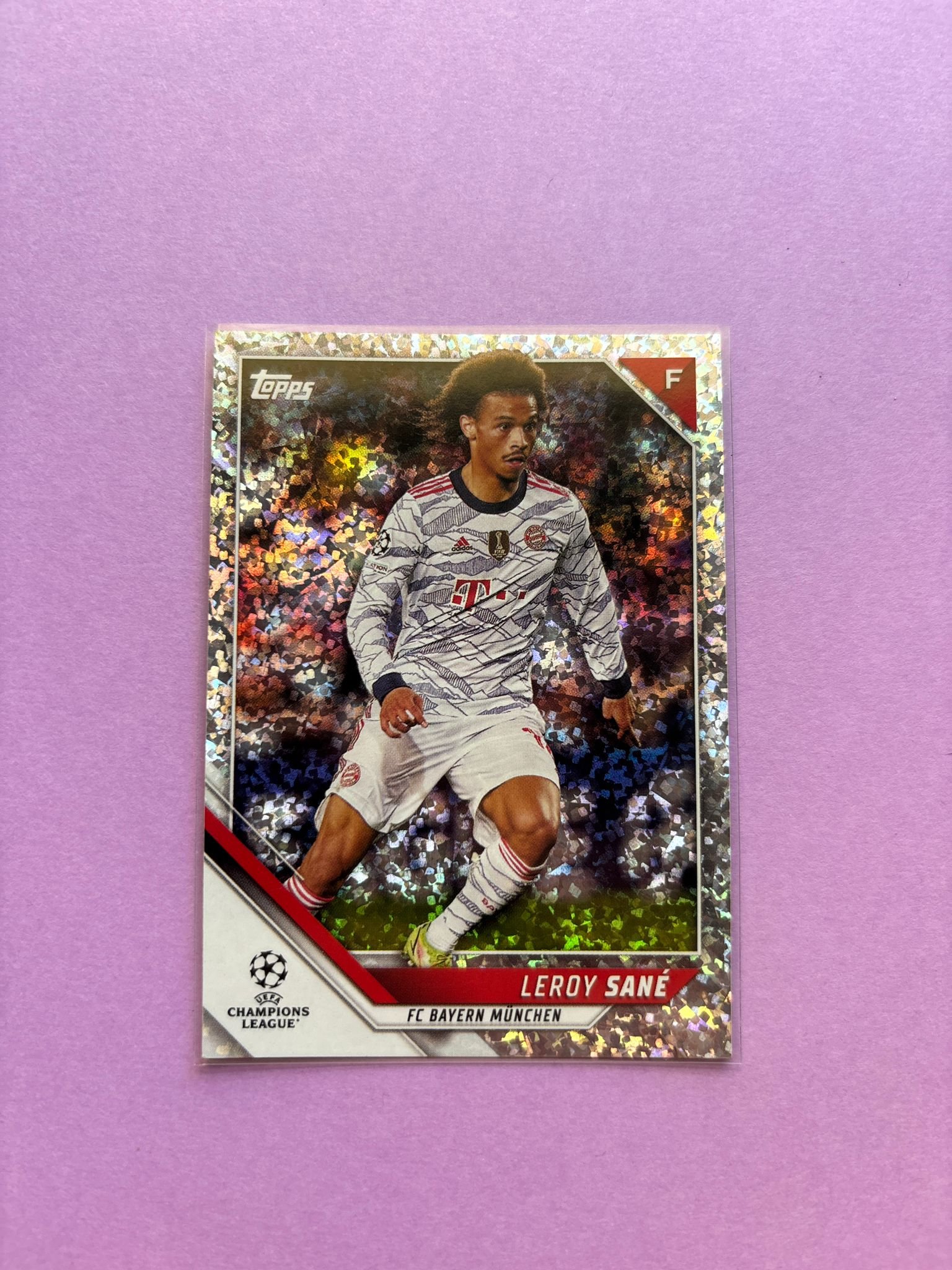 Carta de Topps Chrome Ucl en su Sleeve en perfecto estado, del jugador Leroy Sané en el Bayern München en la temporada 2021/2022 en su edicion especial Speckle Refractor.