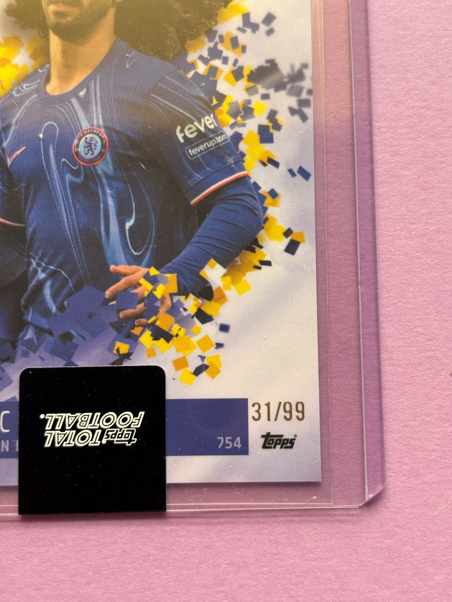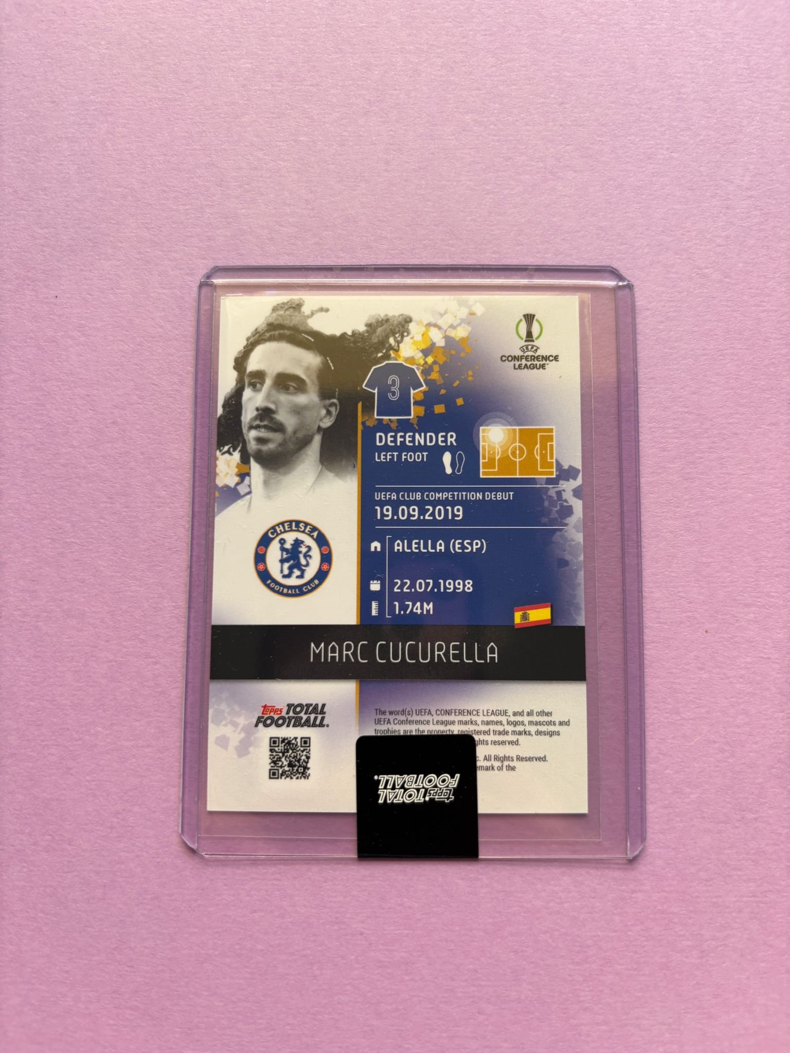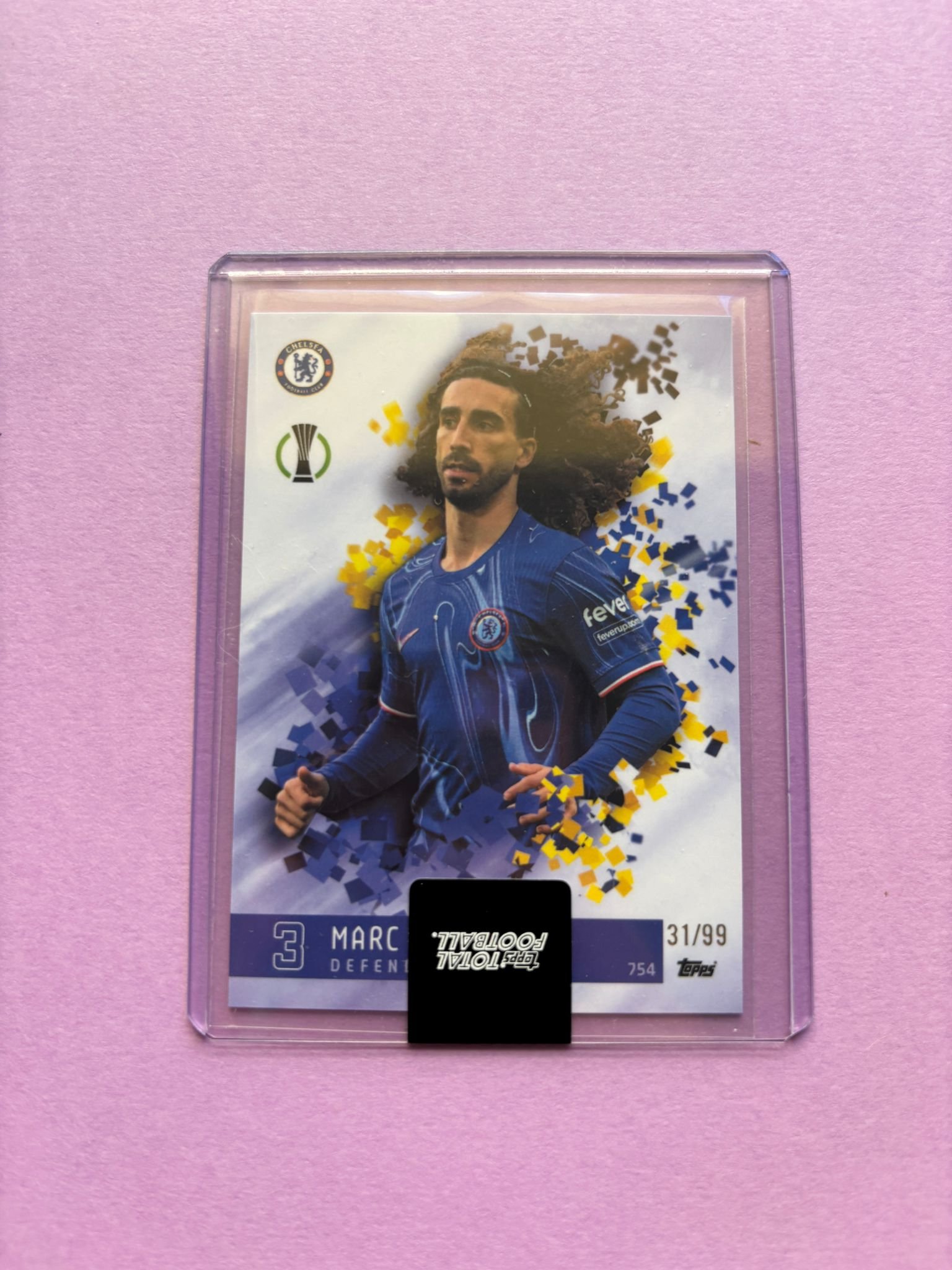 Carta de Topps Total Football Base Set en su TopLoader en perfecto estado, del jugador Marc Cucurella en el Chelsea FC en la temporada 2024/2025 en su versión Base Set con la numeración 31/99.