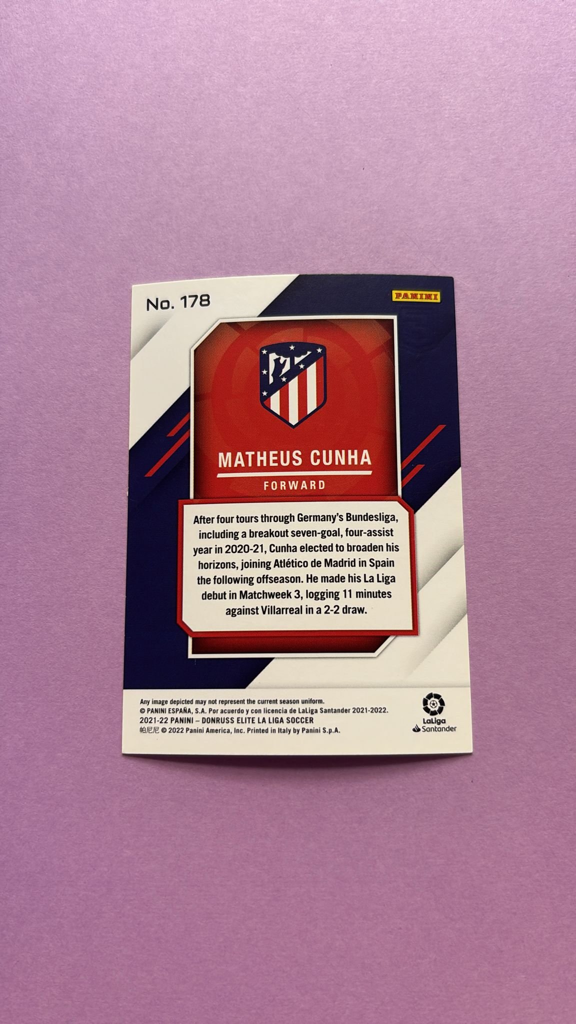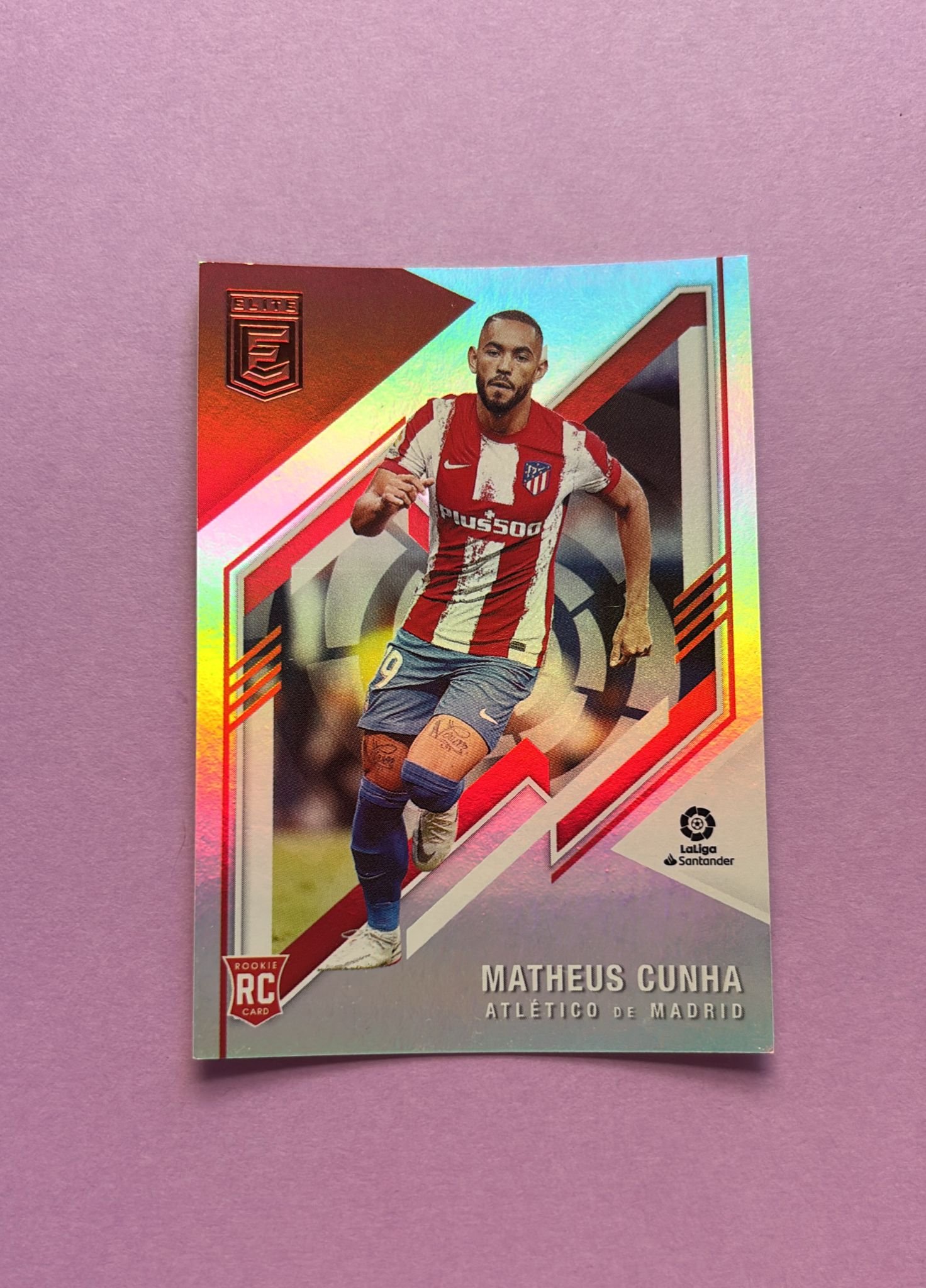 Carta de Panini Donruss Elite La Liga en su Sleeve en perfecto estado, del jugador Matheus Cunha en el Atlético de Madrid en la temporada 2021/2022 en su edición especial Base.