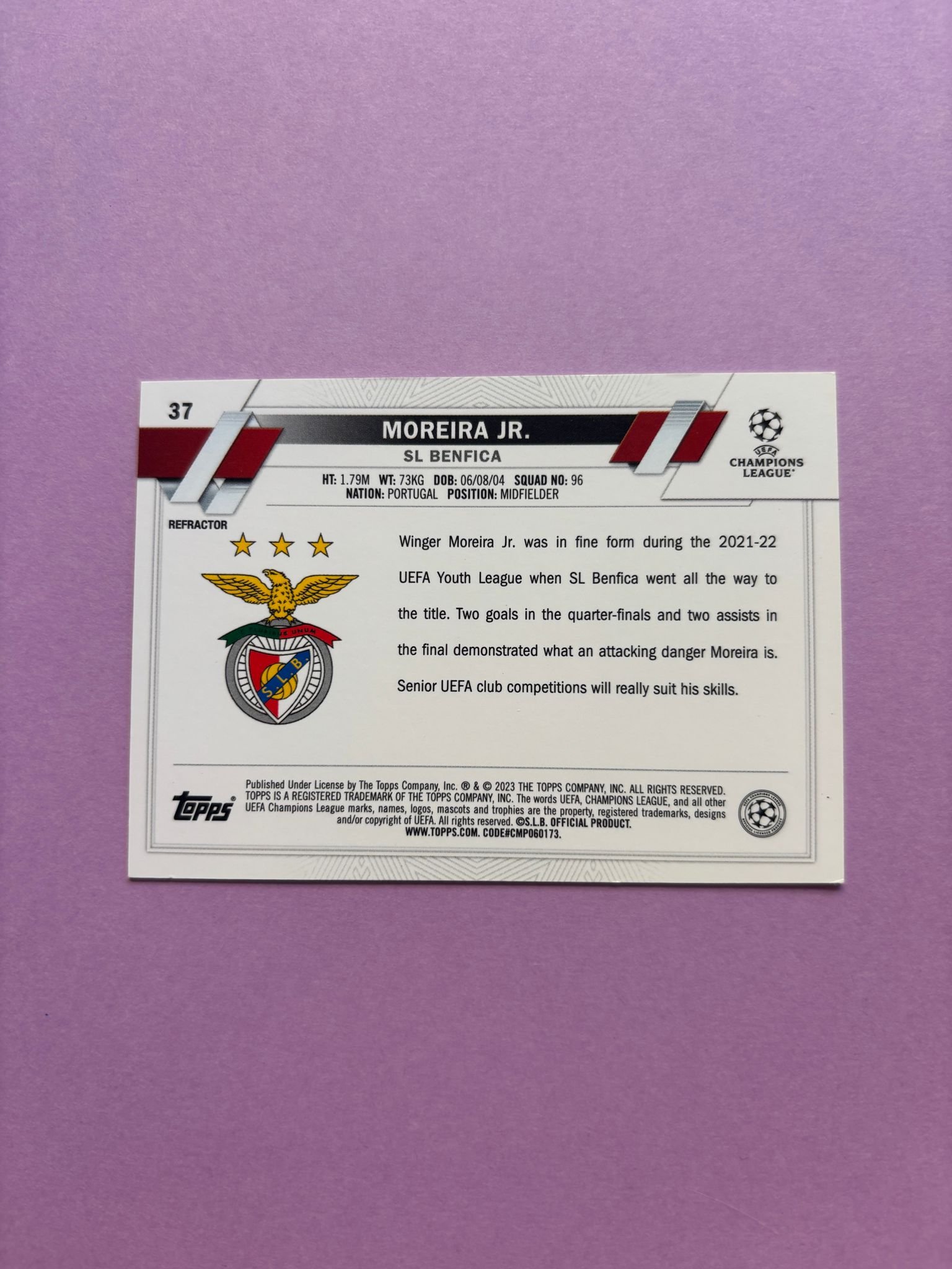 Carta de Topps Chrome UEFA Club Competitions en su Sleeve en perfecto estado, del jugador Moreira Jr. en la SL Benfica en la temporada 2022/2023 en su edición especial Refractor.