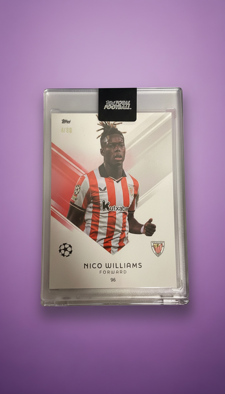 Carta de Topps Total Football en su metacrilato en perfecto estado, del jugador Nico Williams en el Athletic Club en la temporada 2025/2026 con numeración 4/99