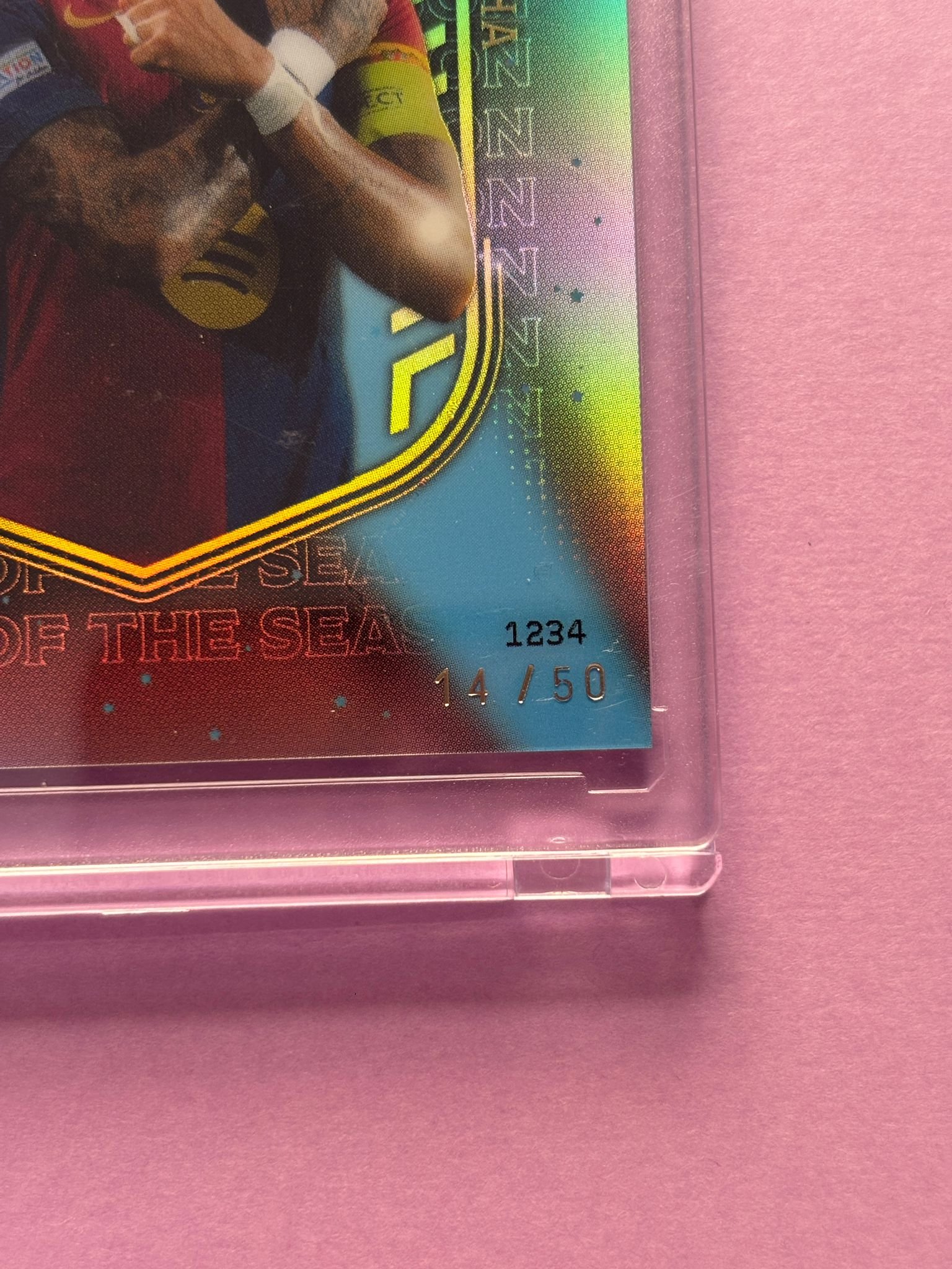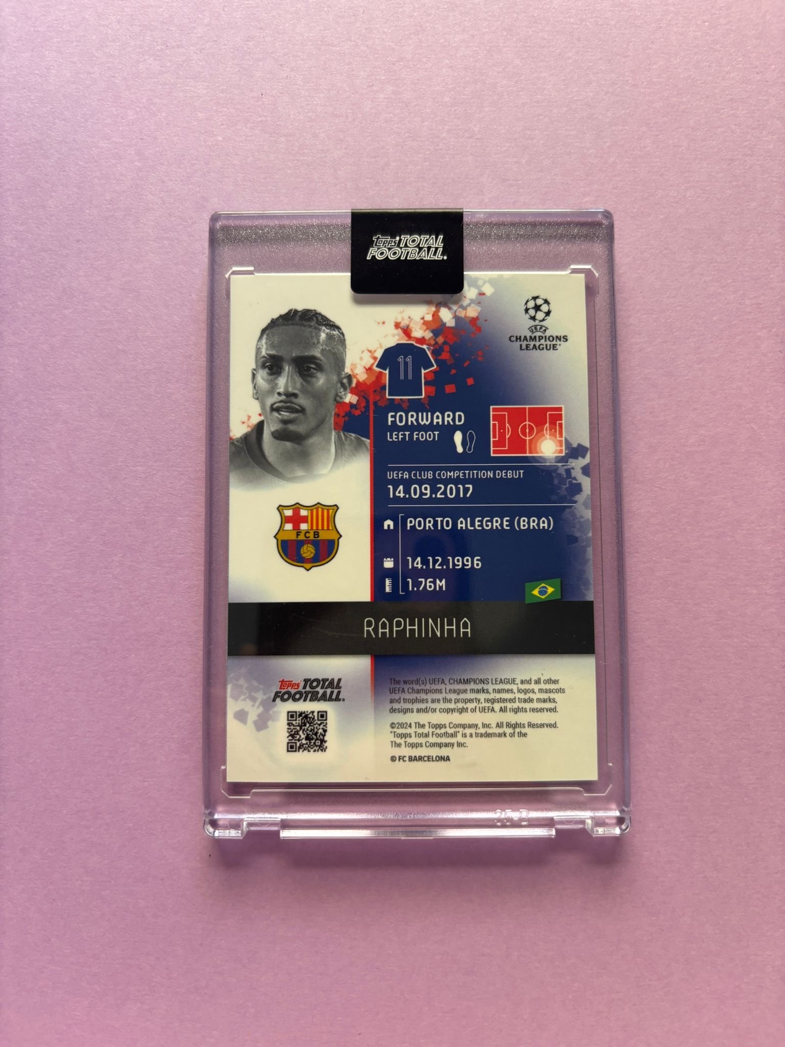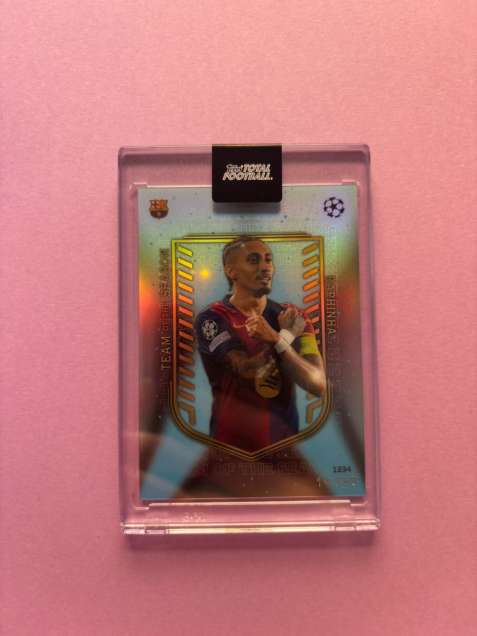 Carta de Topps Total Football en su Metacrilato en perfecto estado, del jugador Raphinha en el Barcelona en la temporada 2024/2025 en su versión TEAM OF THE SEASON con la numeración 14/50.