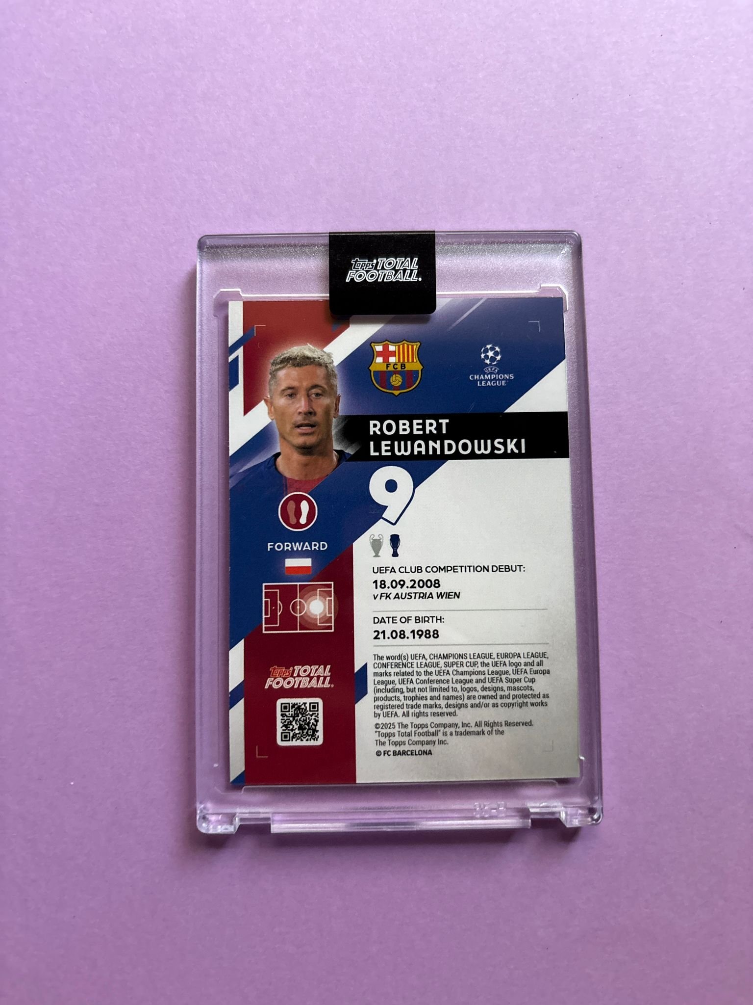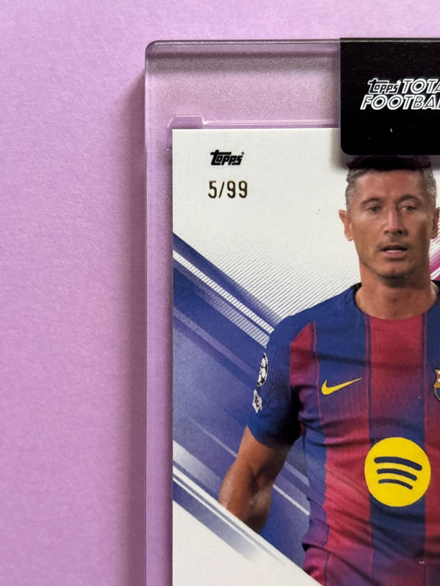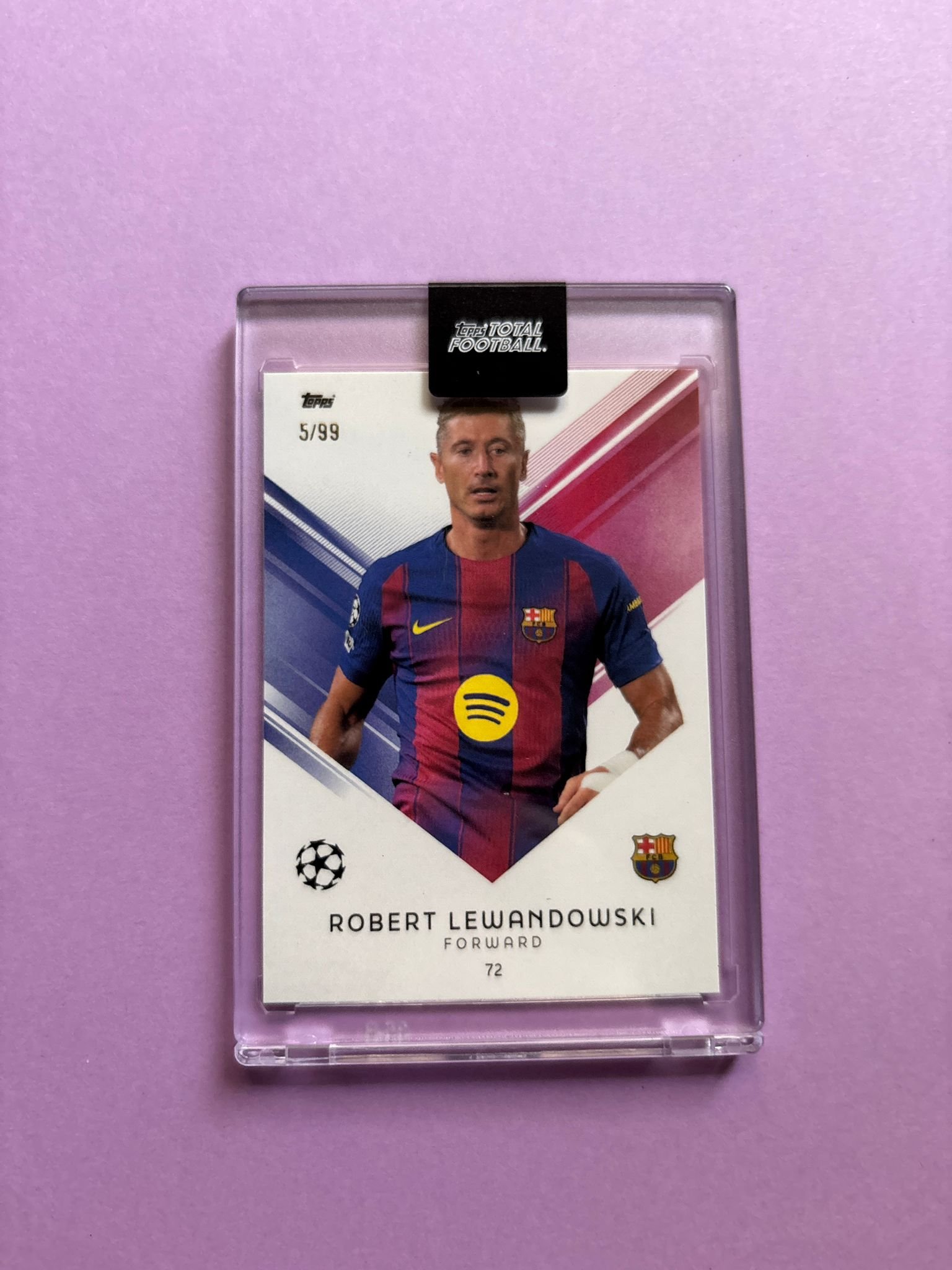 Carta de Topps Total Football en su Metacrilato en perfecto estado, del jugador Robert Lewandowski en el Barcelona en la temporada 2025/2026 en su versión BASE SET con la numeración 5/99.