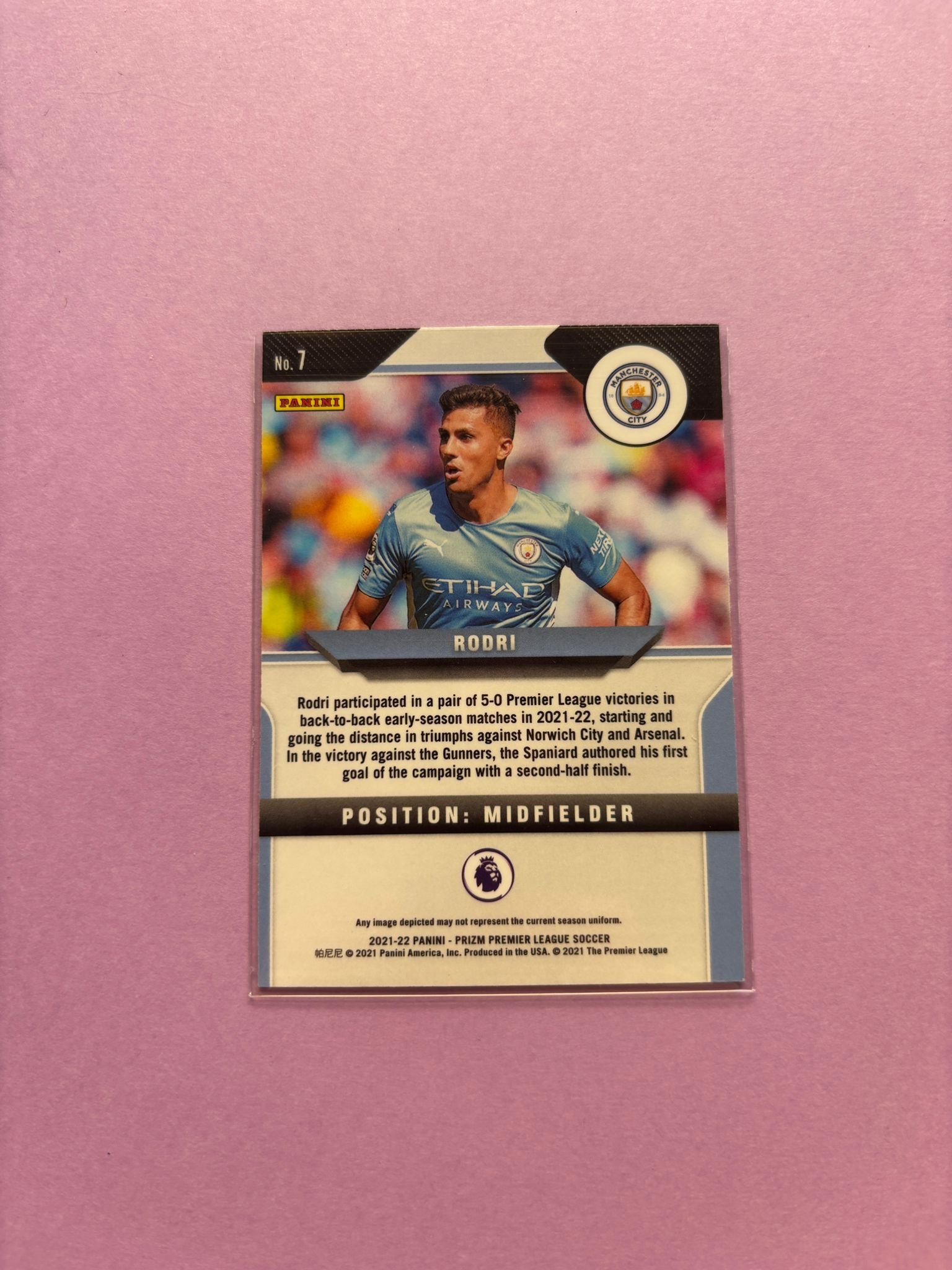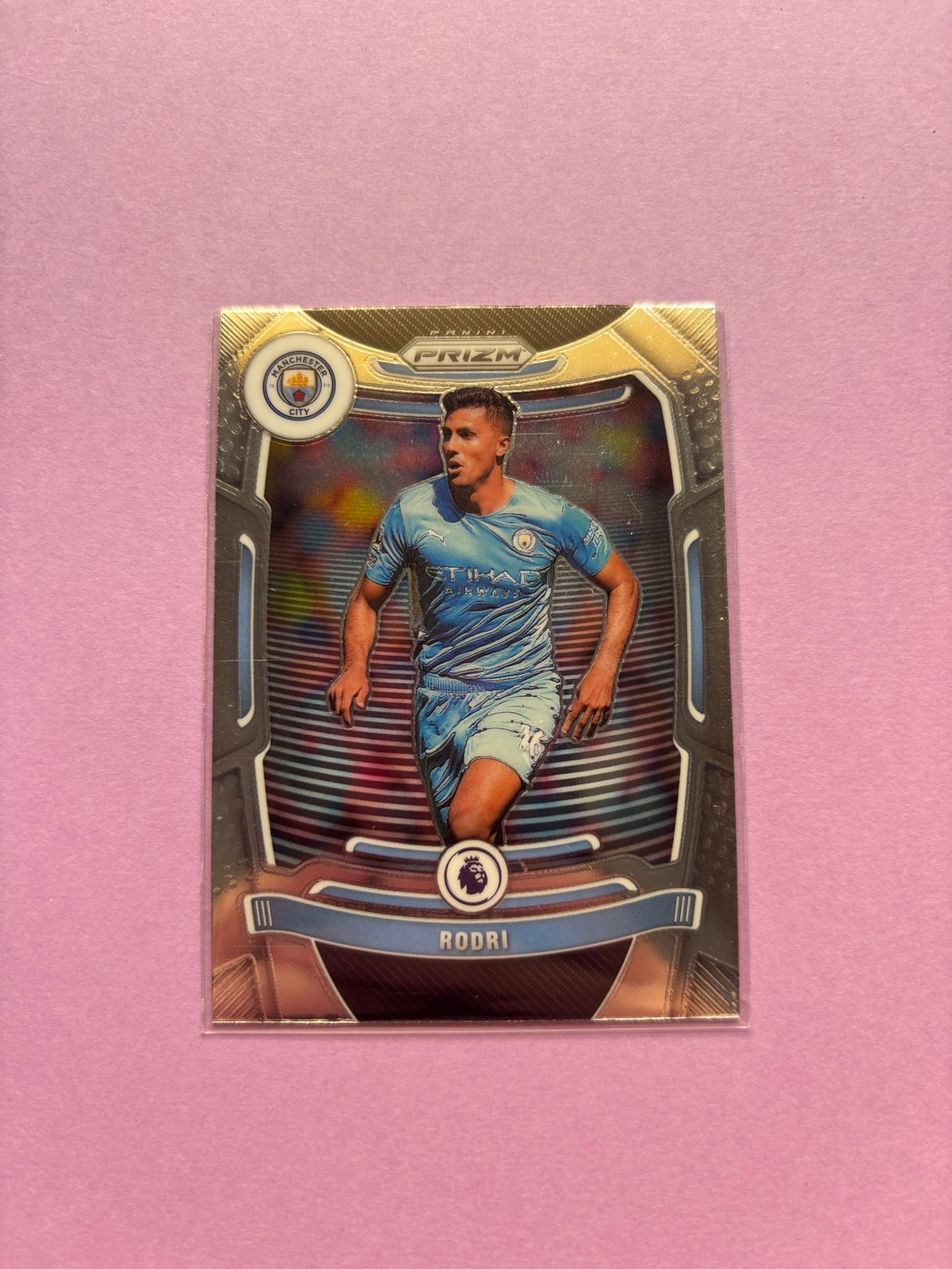 Carta de Panini Prizm Premier League en su Sleeve en perfecto estado, del jugador Rodri (Rodrigo Hernández) en el Manchester City en la temporada 2021/2022 en su edición especial Base.