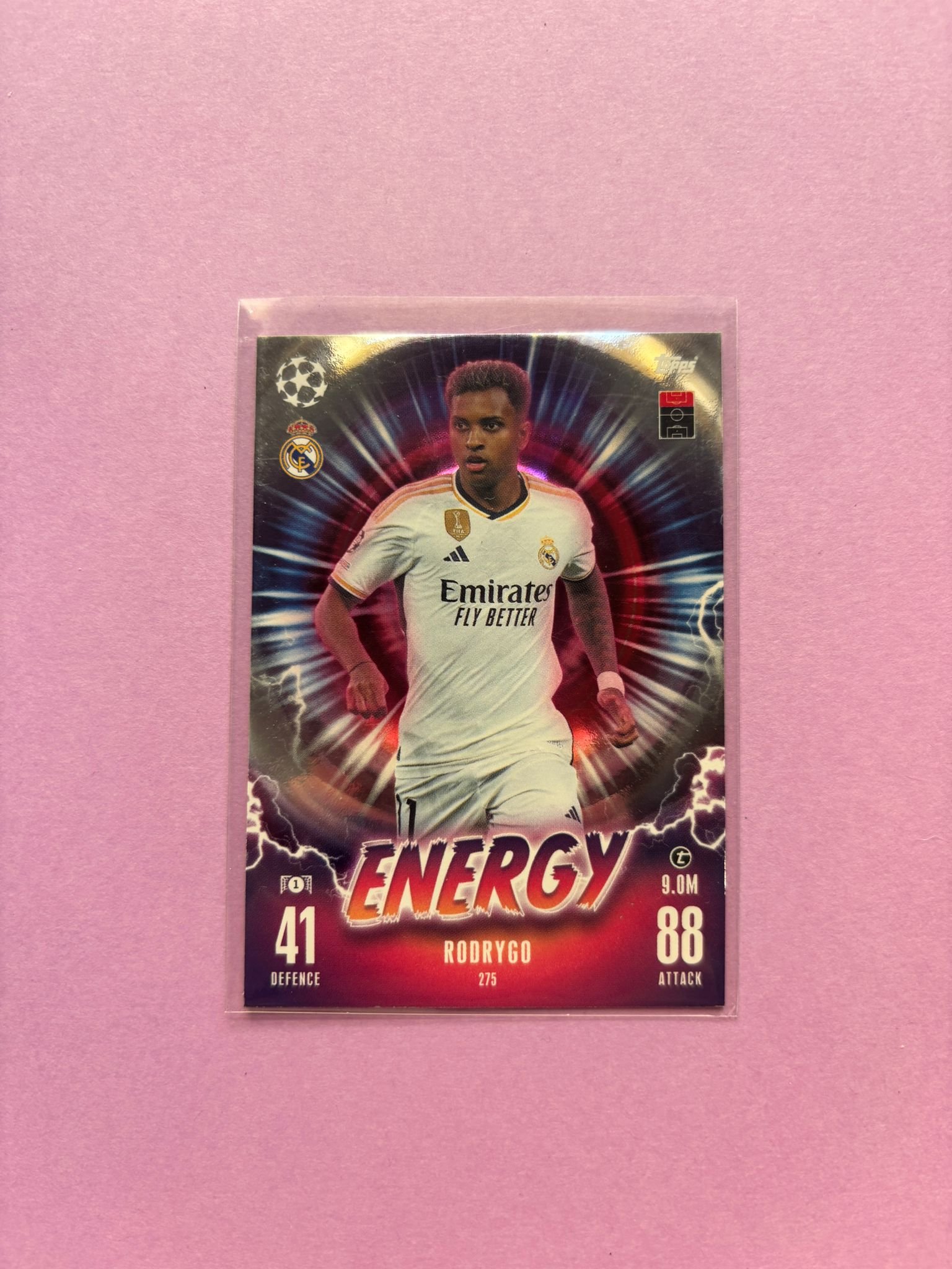 Carta de Topps Match Attax Champions League en su Sleeve en perfecto estado, del jugador Rodrygo en el Real Madrid en la temporada 2023/2024 en su versión Energy.