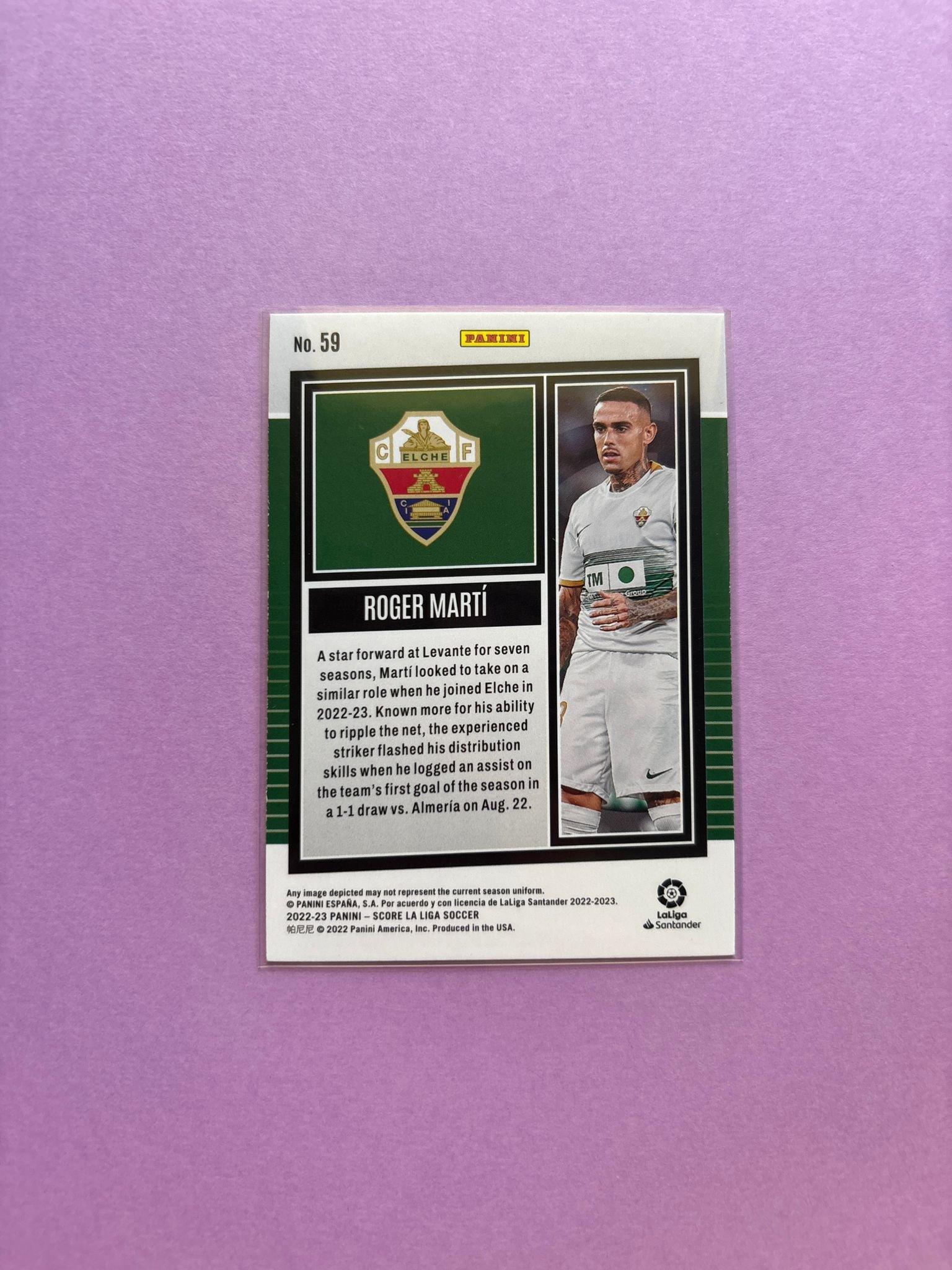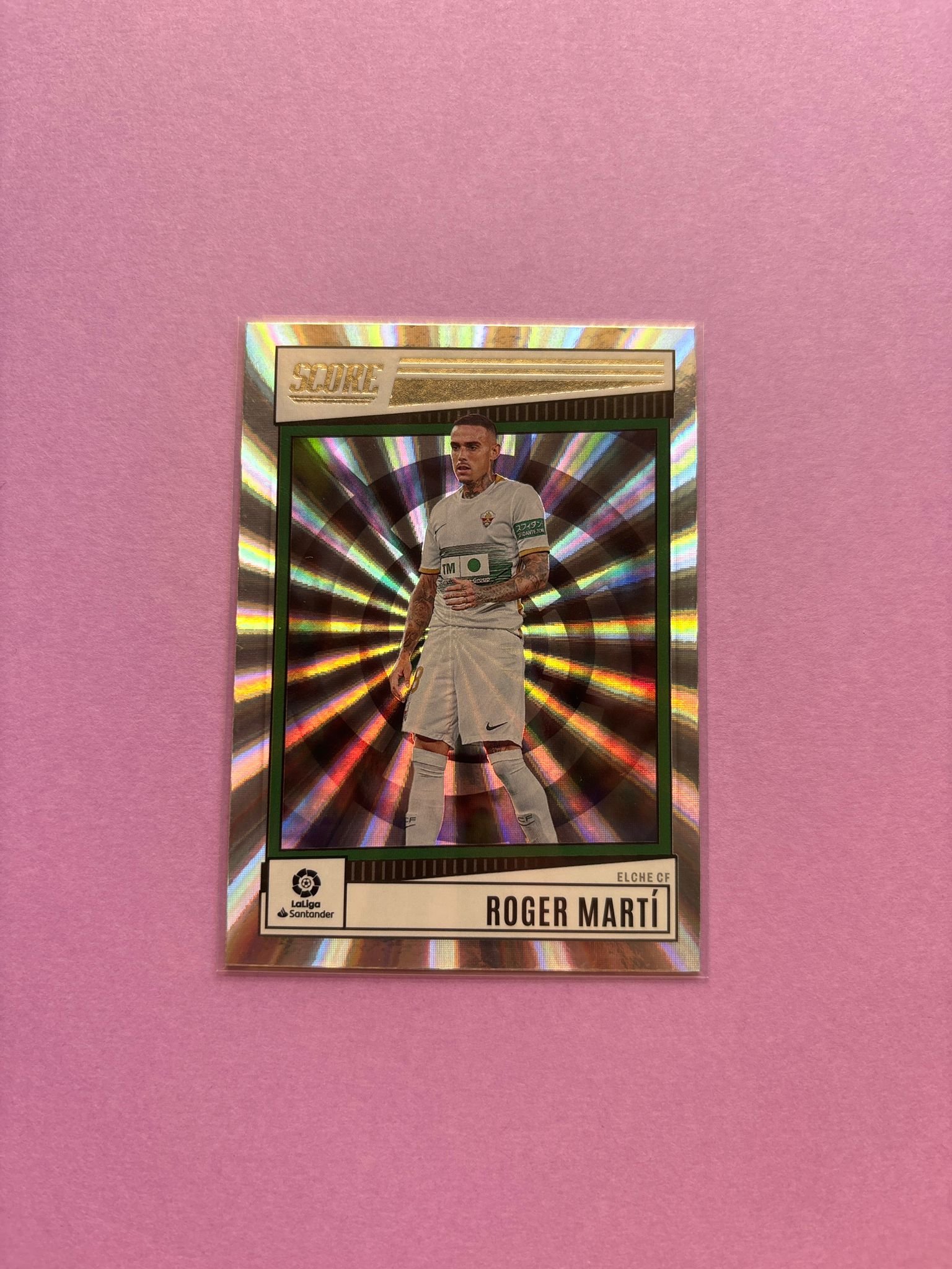 Carta de Panini Score La Liga en su Sleeve en perfecto estado, del jugador Roger Martí en el Elche CF en la temporada 2022/2023 en su edición especial Lasers.