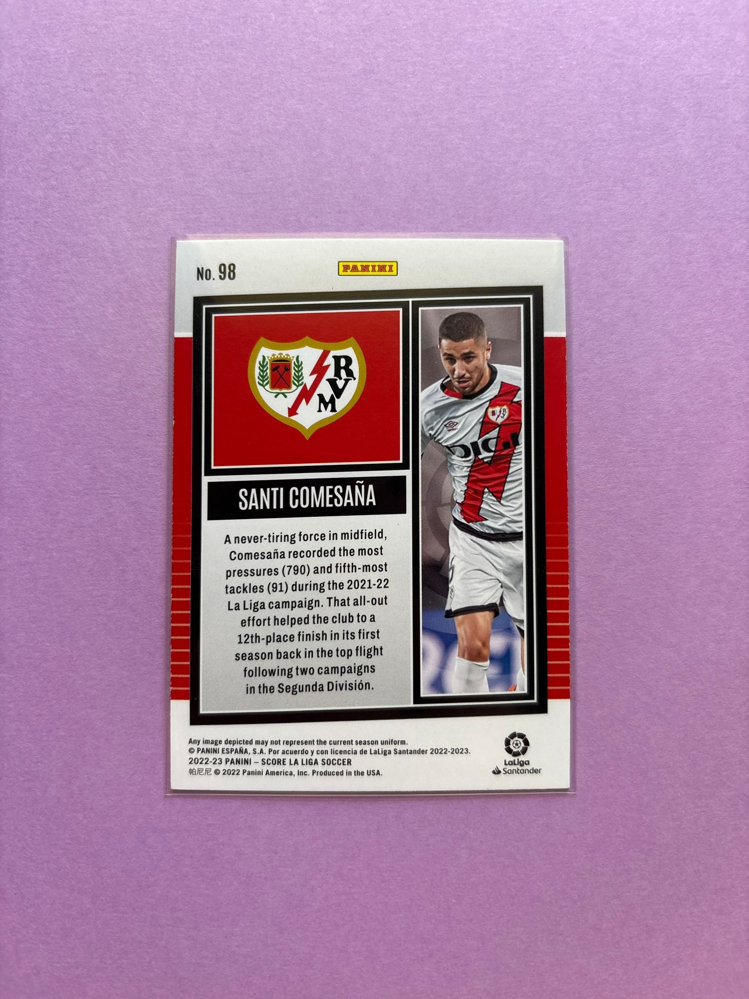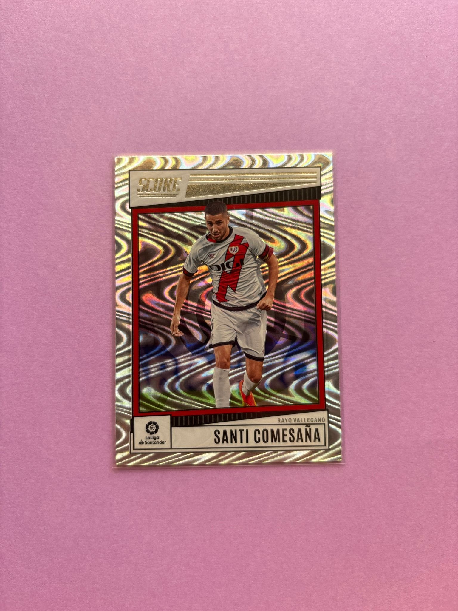 Carta de Panini Score La Liga en su Sleeve en perfecto estado, del jugador Santi Comesaña en el Rayo Vallecano en la temporada 2022/2023 en su edición especial Swirl.