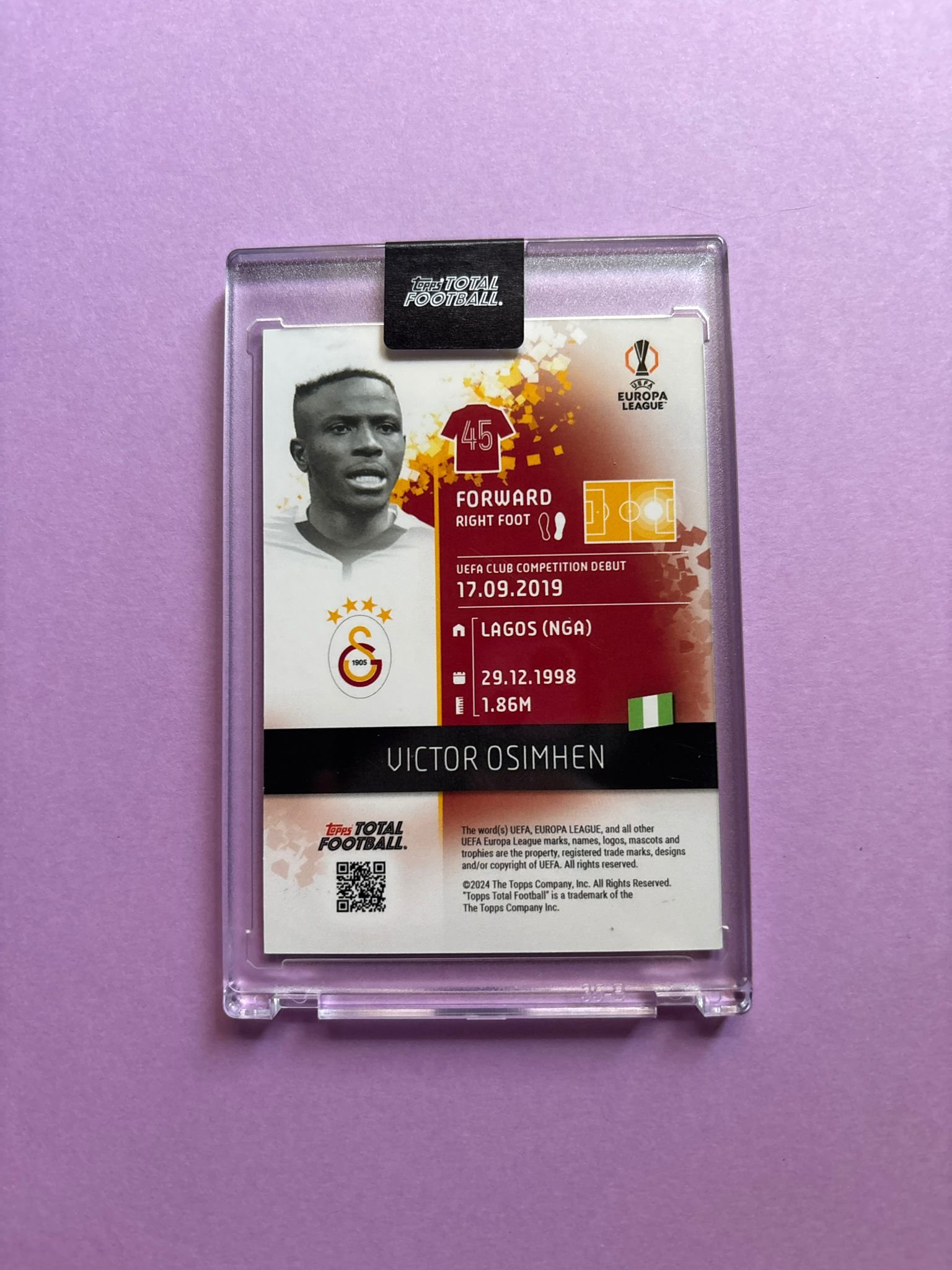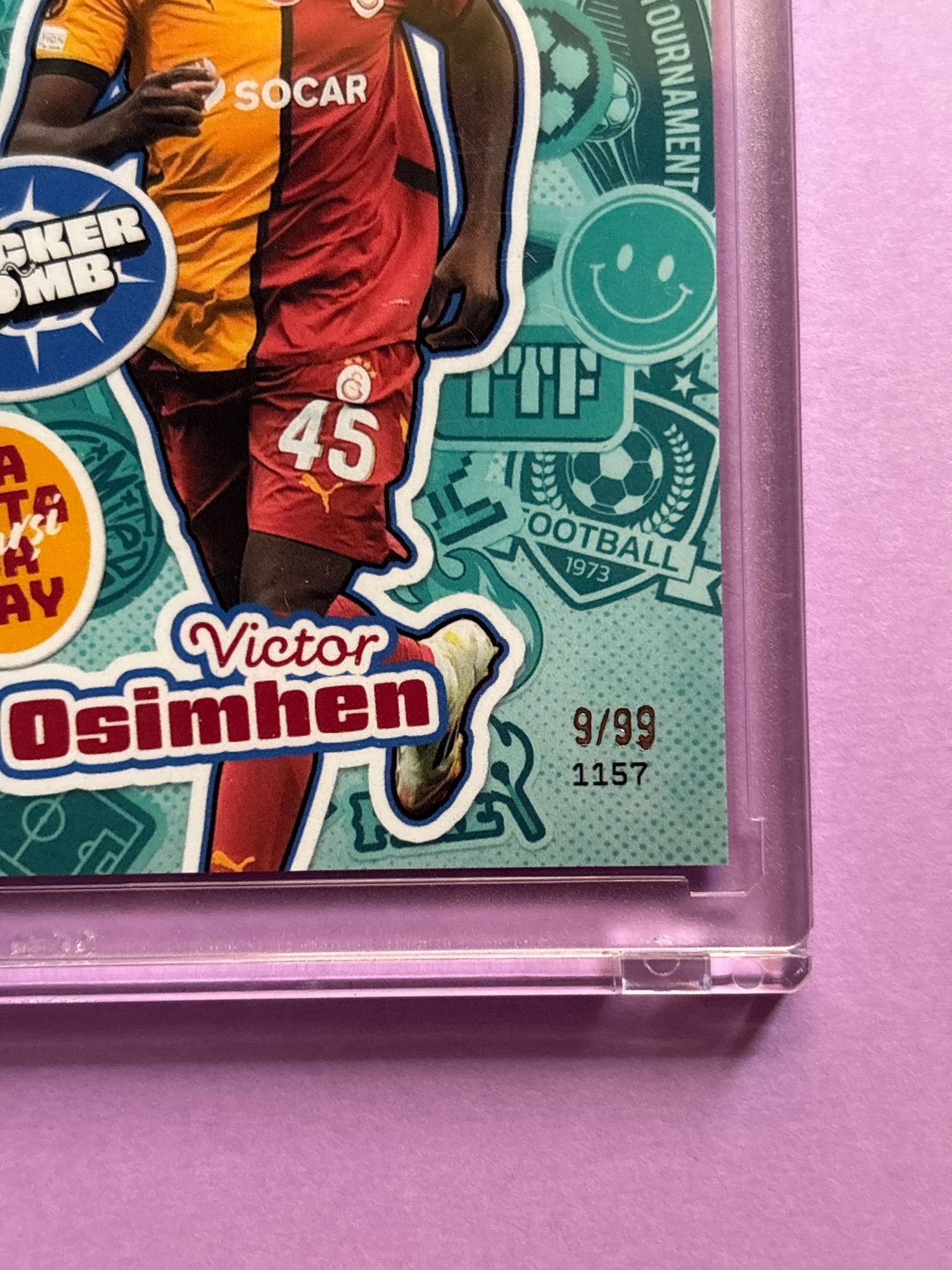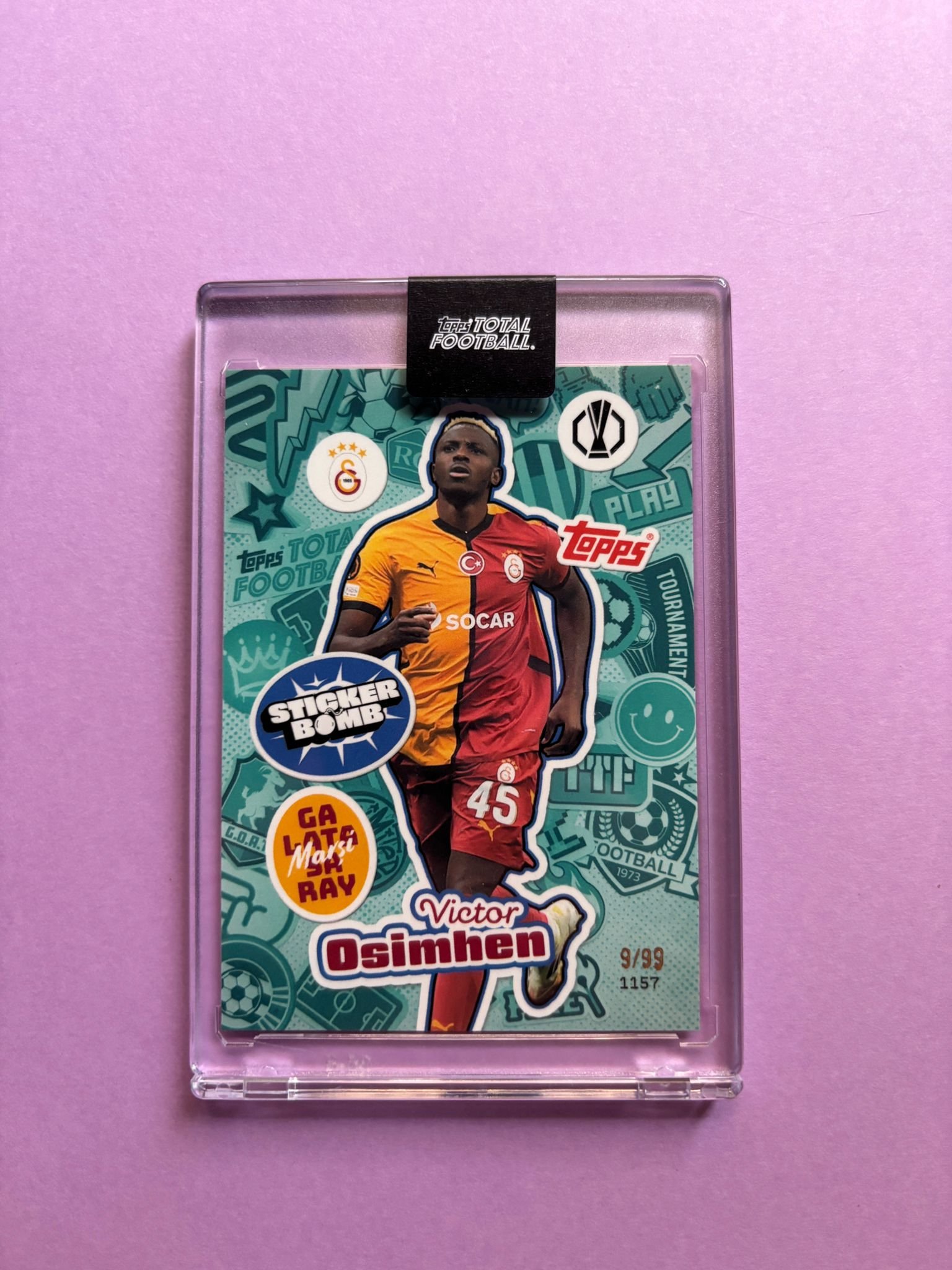 Carta de Topps Total Football en su Metacrilato en perfecto estado, del jugador Victor Osimhen en el Galatasaray en la temporada 2024/2025 en su versión Sticker Bomb con su numeración 9/99.