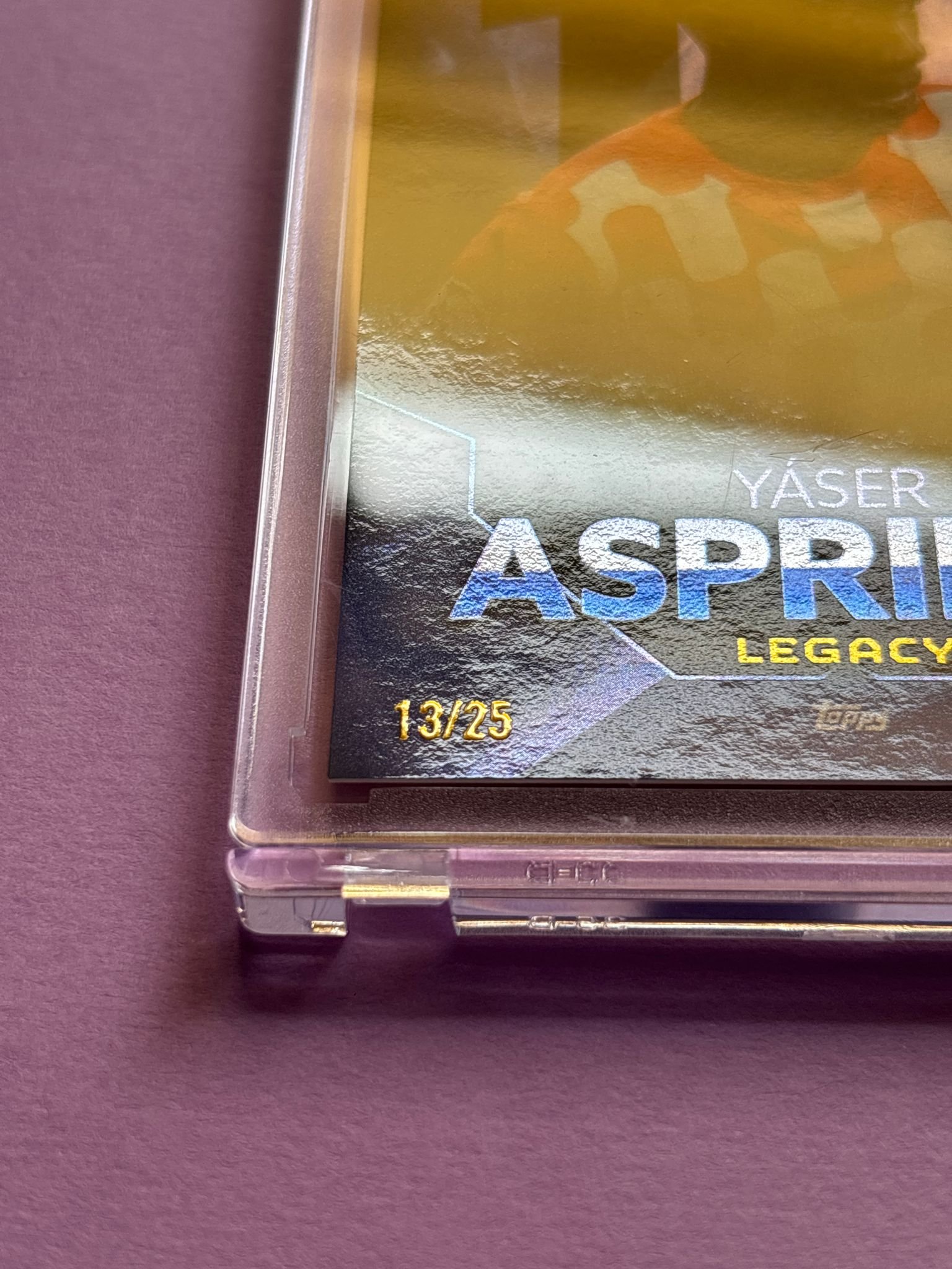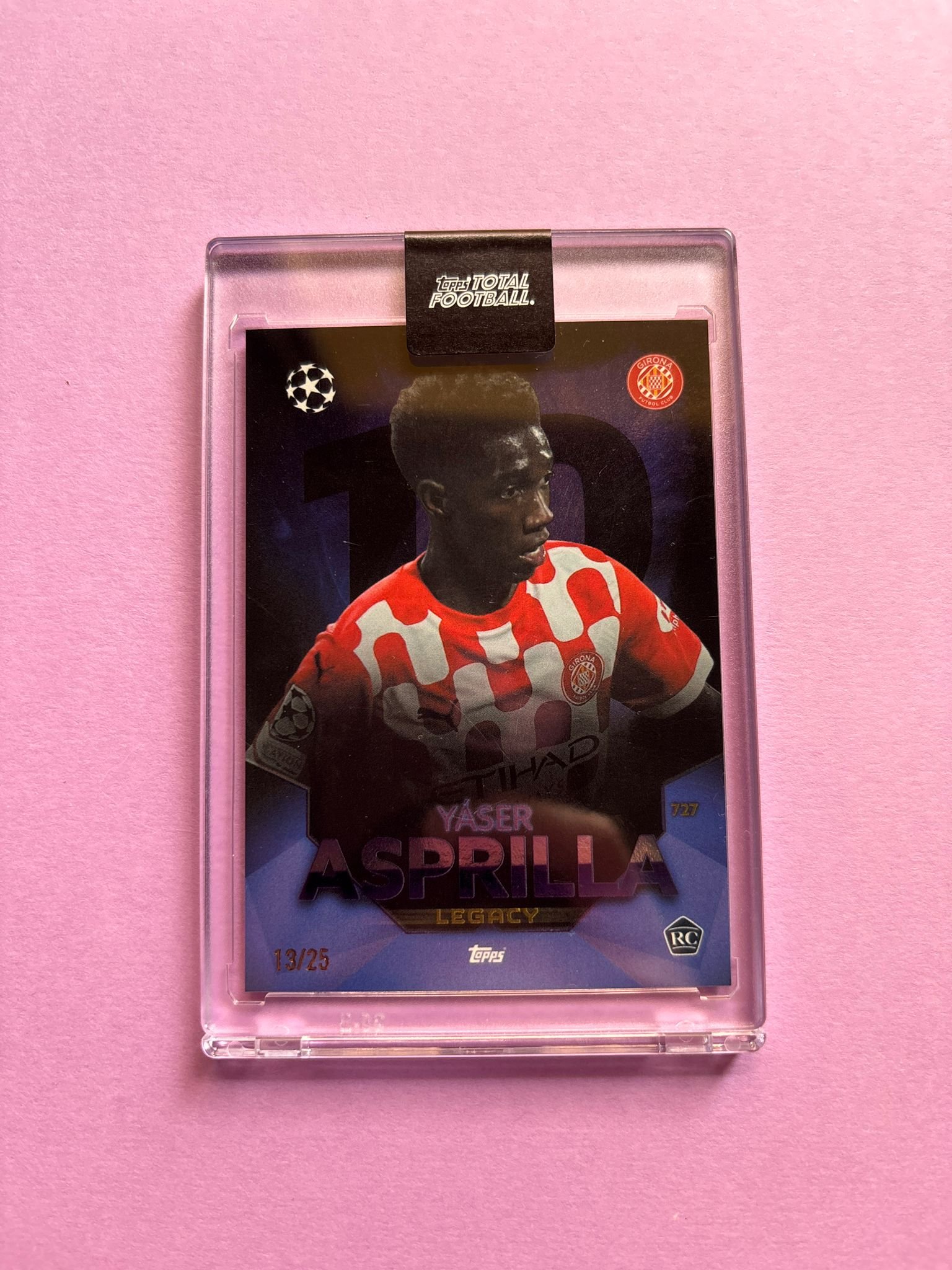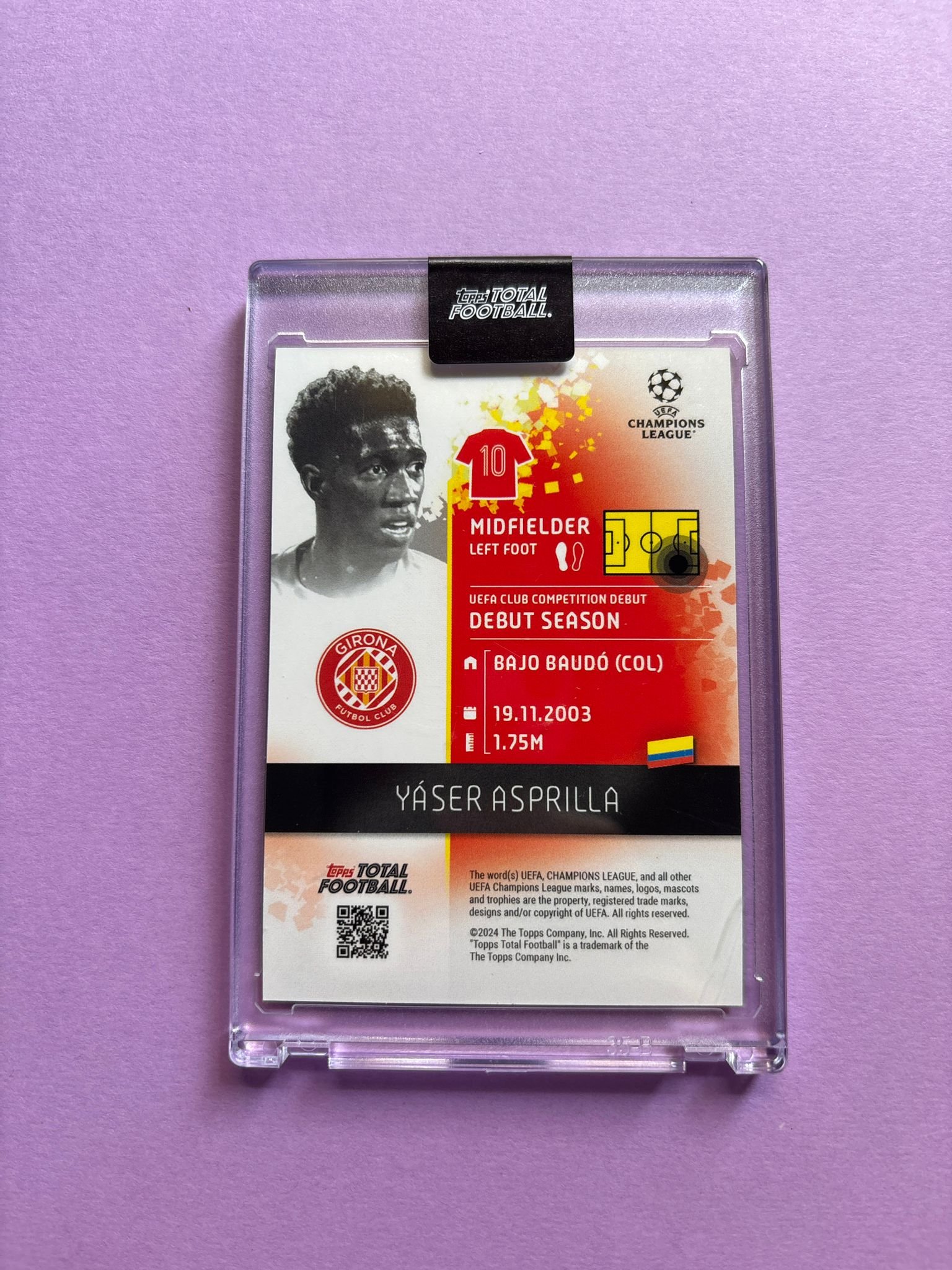 Carta de Topps Total Football en su Metacrilato en perfecto estado, del jugador Yáser Asprilla en el Girona FC en la temporada 2024/2025 en su versión LEGACY con su numeración 18/25.